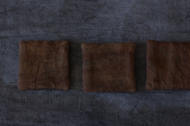 独自に染色を始められたaimai、田島さん。柿渋、藍、松煙、時には土に埋めたり。実験的なこともされながら、1点もの感覚で制作をされています。 【素材】 布 【サイズ】 約6×6cm 【備考】 天然染料で染め上げている為、経年、洗濯による色褪せがありますが、風合いとしてお楽しみください。 洗濯は、中性の洗剤でお願い致します。色変わりを防ぐ為です。 最初は単体で手洗い、その後も手洗いがお勧めですが、洗濯機の場合はネットに入れて擦れない様に洗濯してください。 洗濯の際、松煙等は色のついた水などが出ることがあります。 途中で落ち着くかと思います。気になる場合は幾度か洗濯してからご利用ください。 酸性の液体や、油で変色がありますのでお気をつけください。 基本的にクリーニングはお勧めしておりません。 アイロンは低温かつ、布を挟んでならば可能です。 ※ご購入前に必ず、カテゴリーにあります「ご購入前の注意事項」をご覧ください。