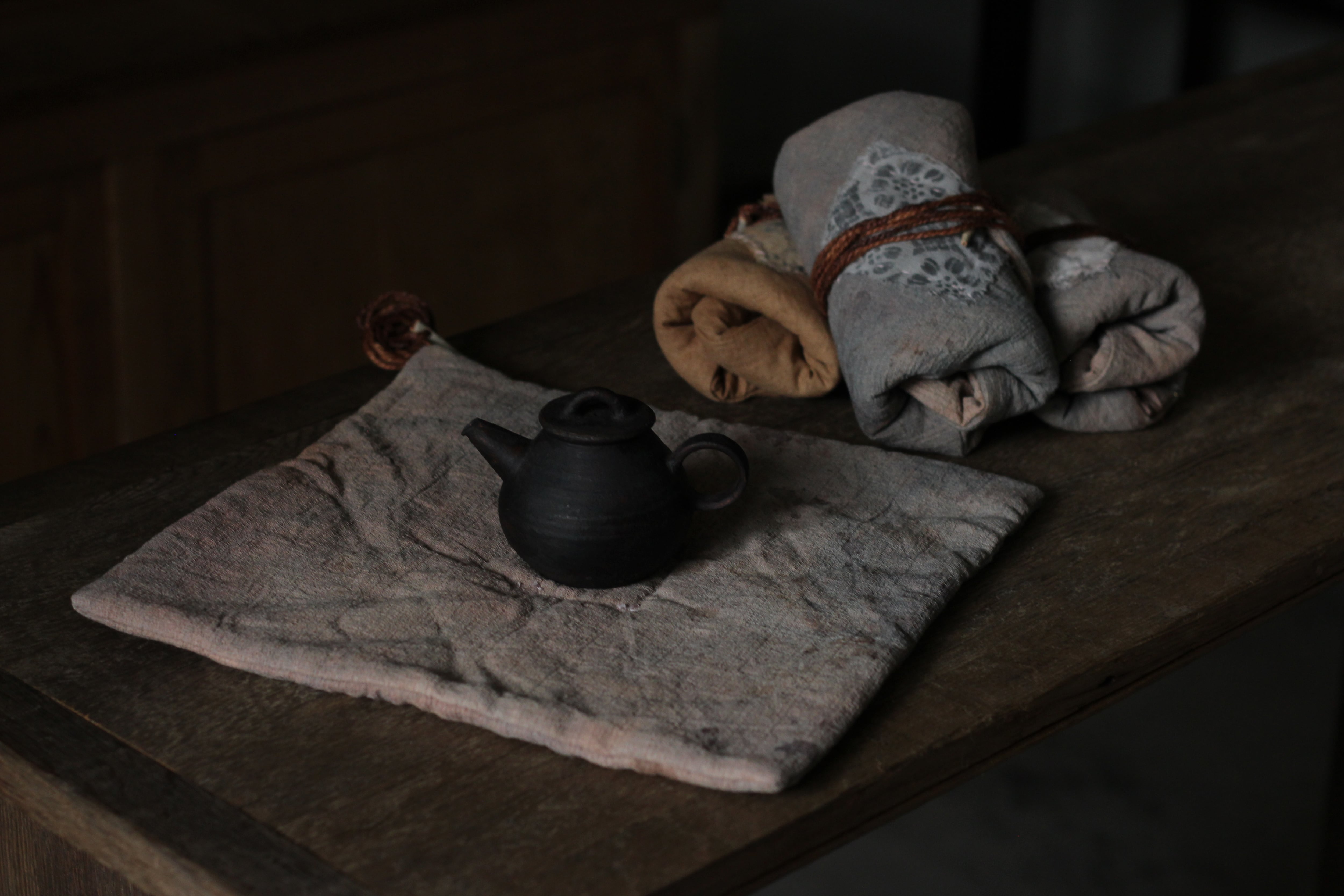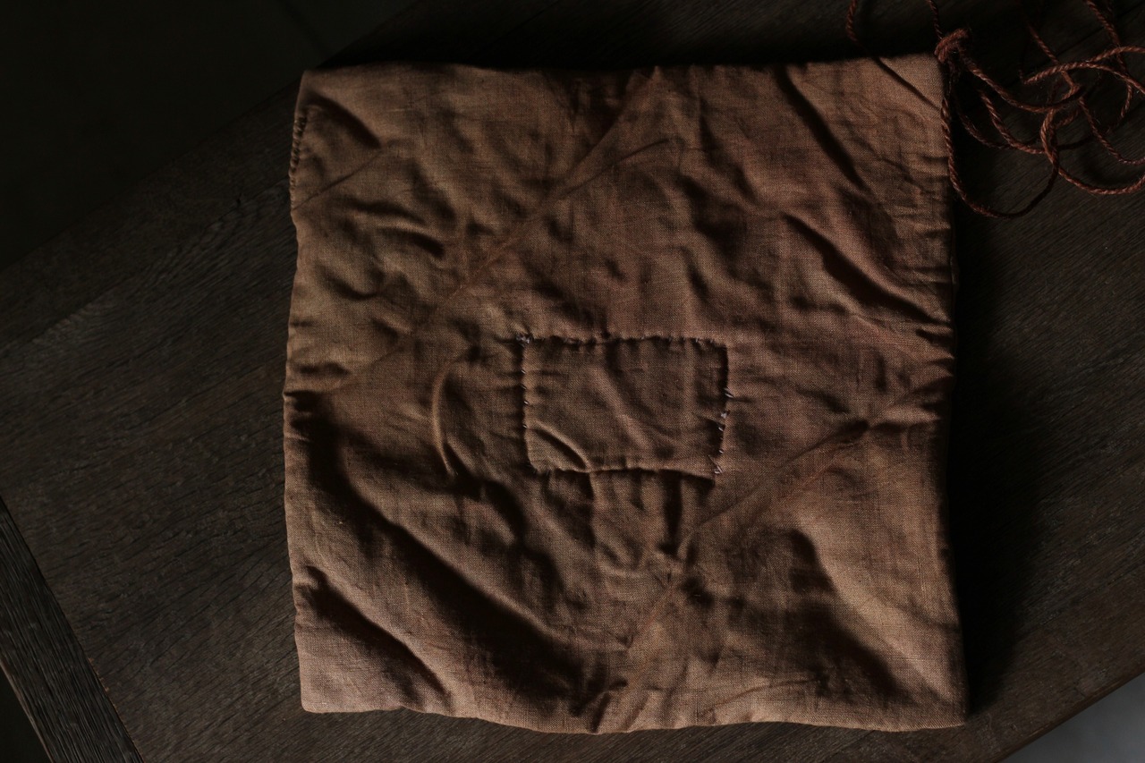 こちらは2枚仕立てのお作りで、ふっくらしています。茶壺を包んで運びやすいようにと、野点用に制作されたものです。ご自宅では茶壺保管用として包んで収納していただいたり、使用しないときには敷物としてもお使いいただけます。