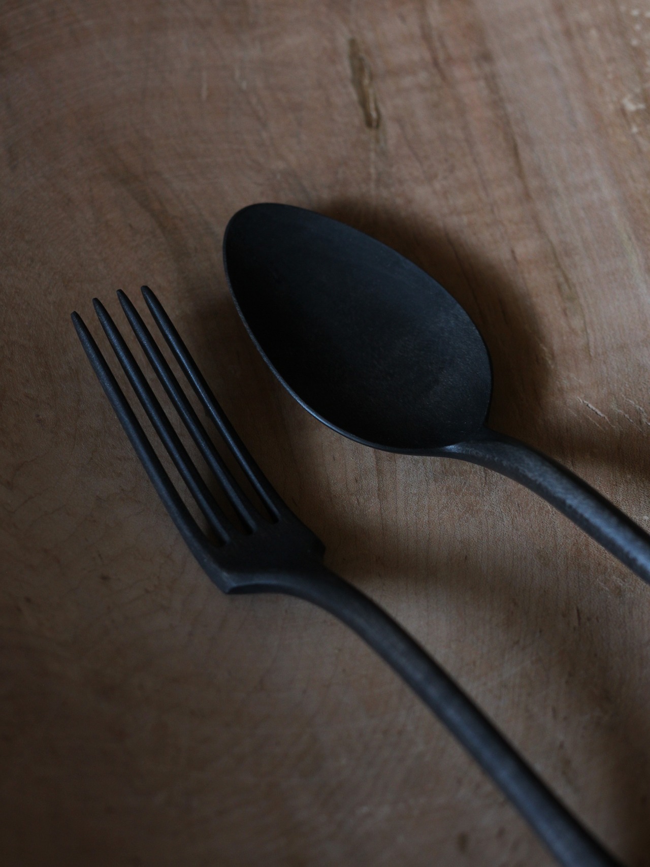 北山さんはアンティークがお好きで、デザインが頭の中に入っていると仰っていました。こちらのカトラリーもその雰囲気を纏っている作品です。