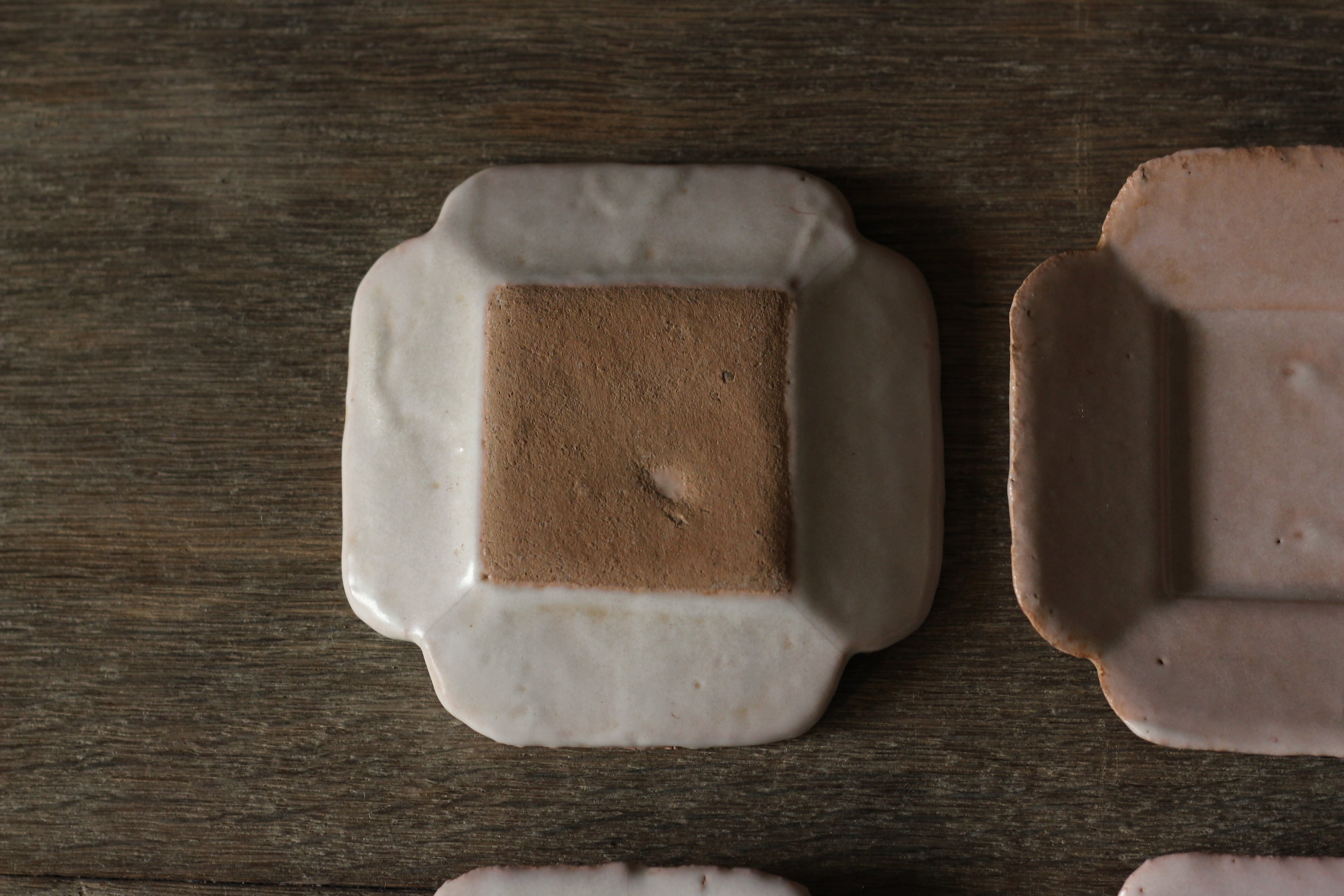 こちらは低温で焼いたあとに拭き漆を施していて、温かみのある柔らかい印象の作品に仕上がっています。ピンク色に発色する釉薬です。写真ですとわかりづらいかもしれませんが、白っぽい作品でもややピンクがかっております。