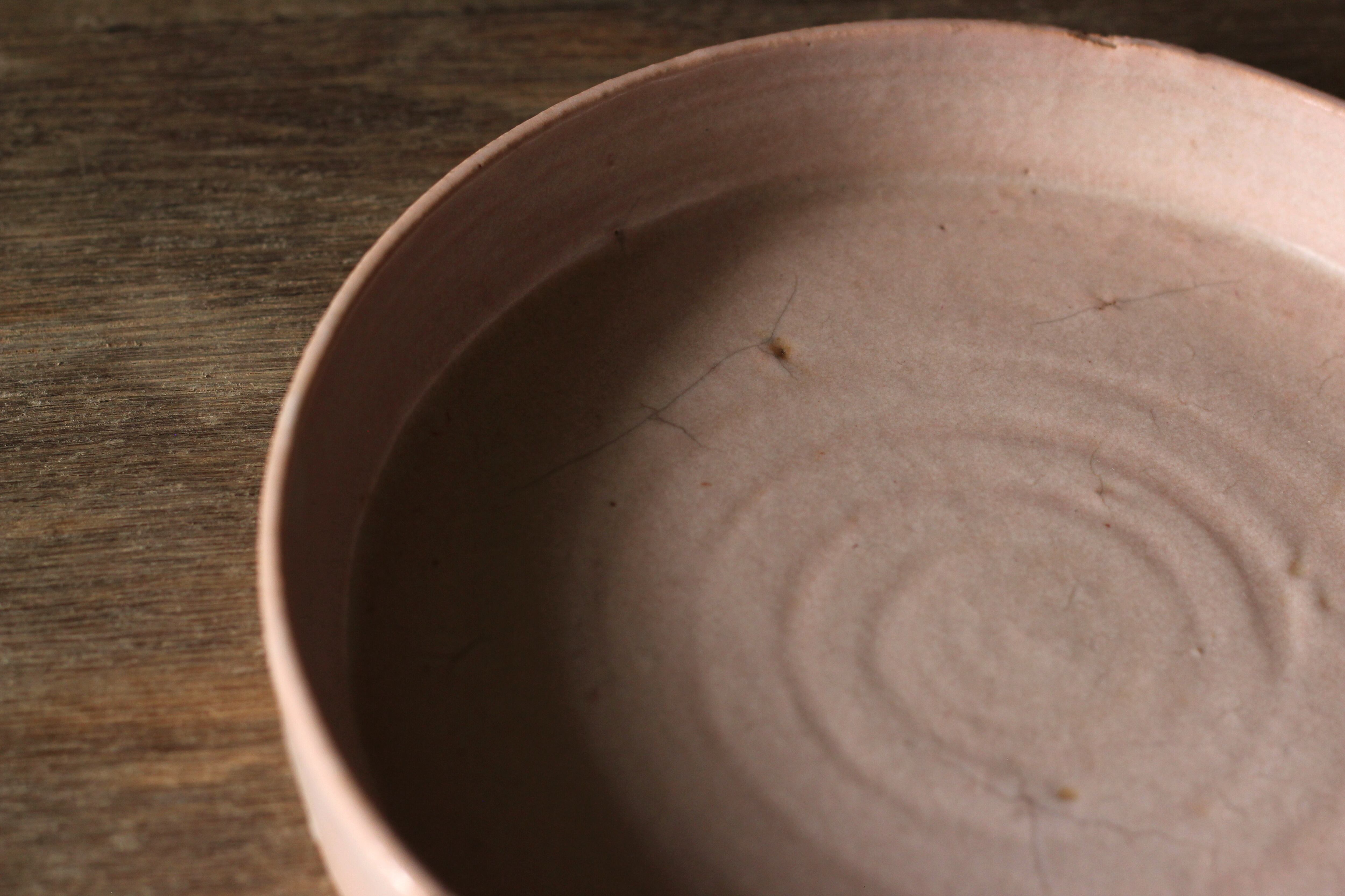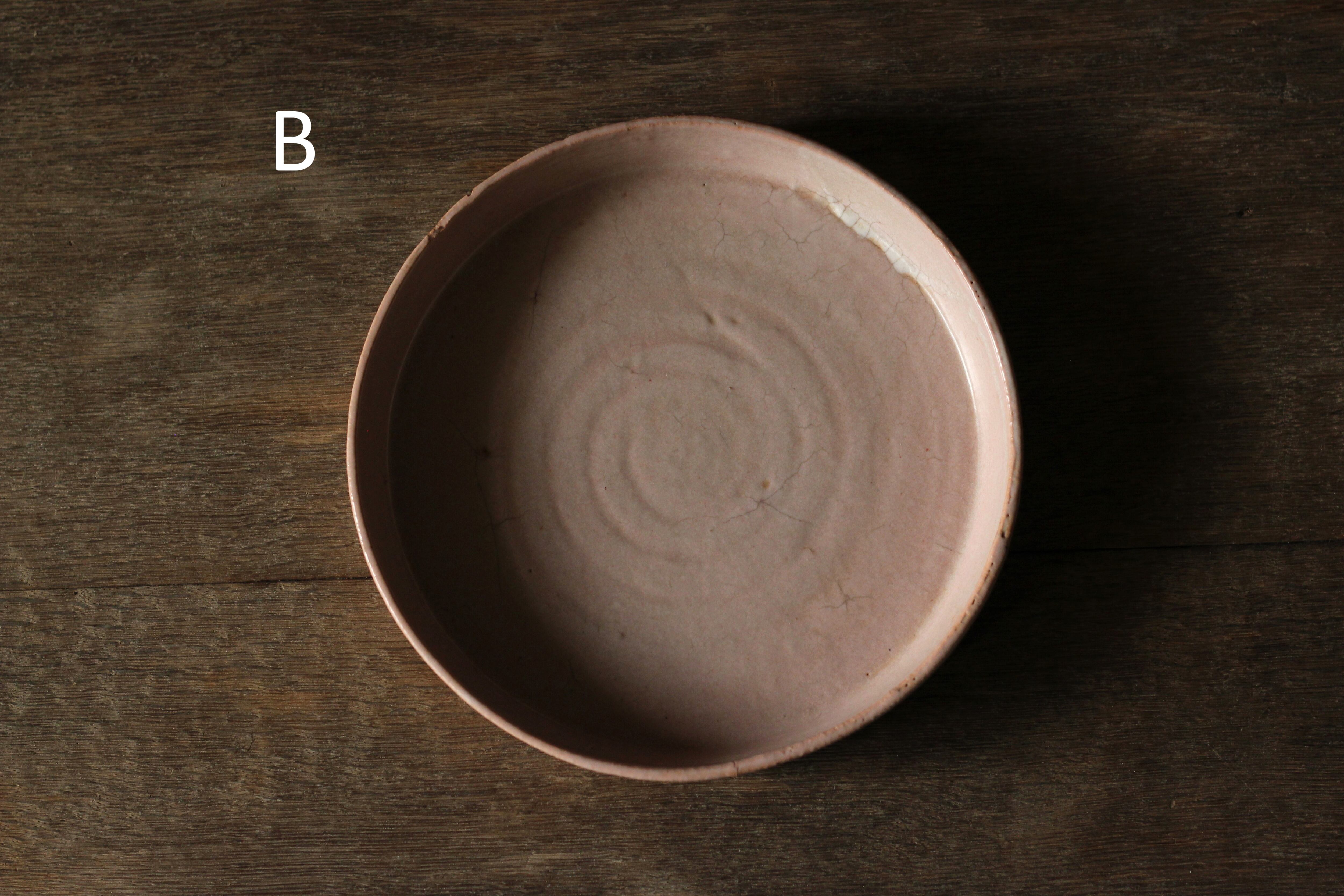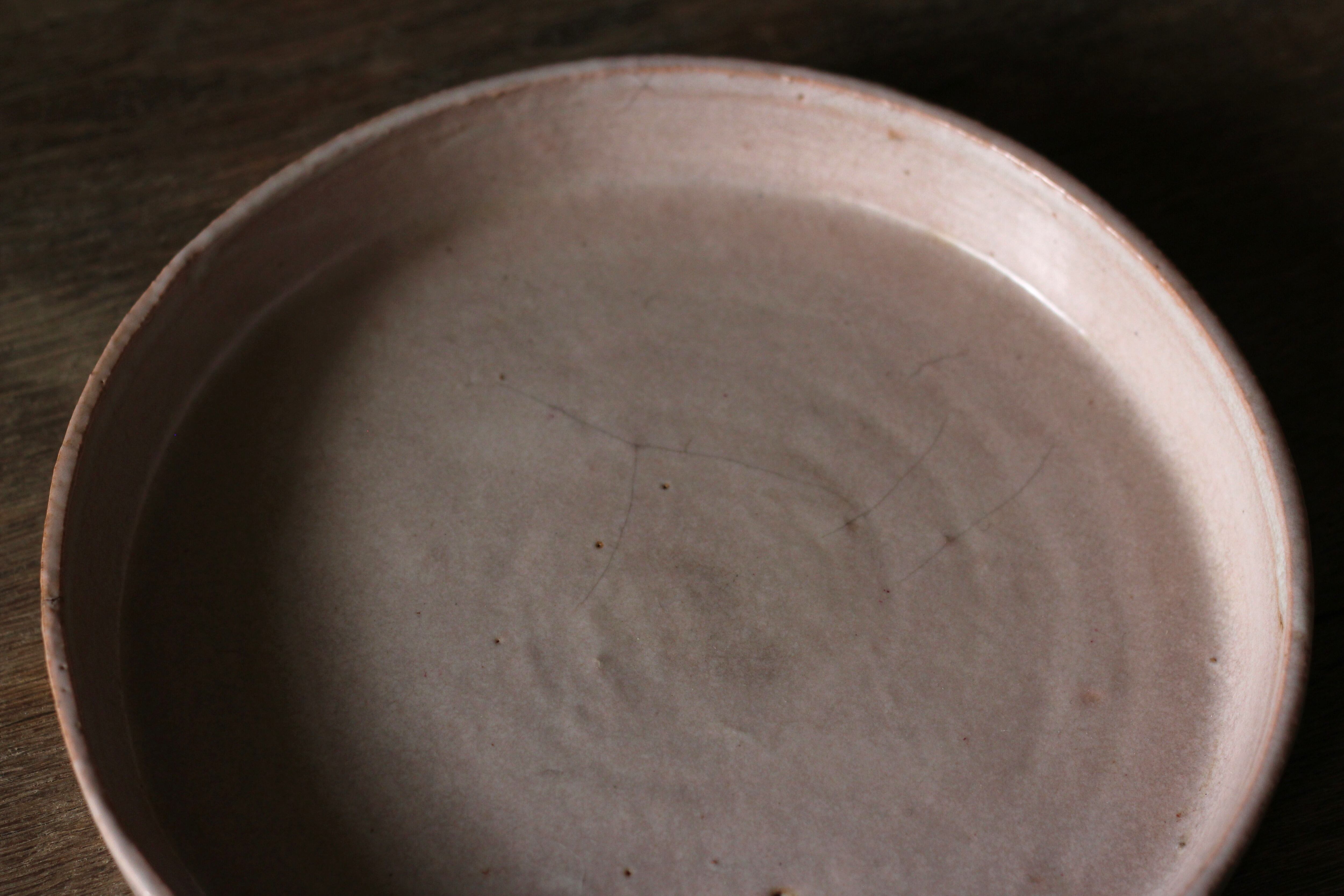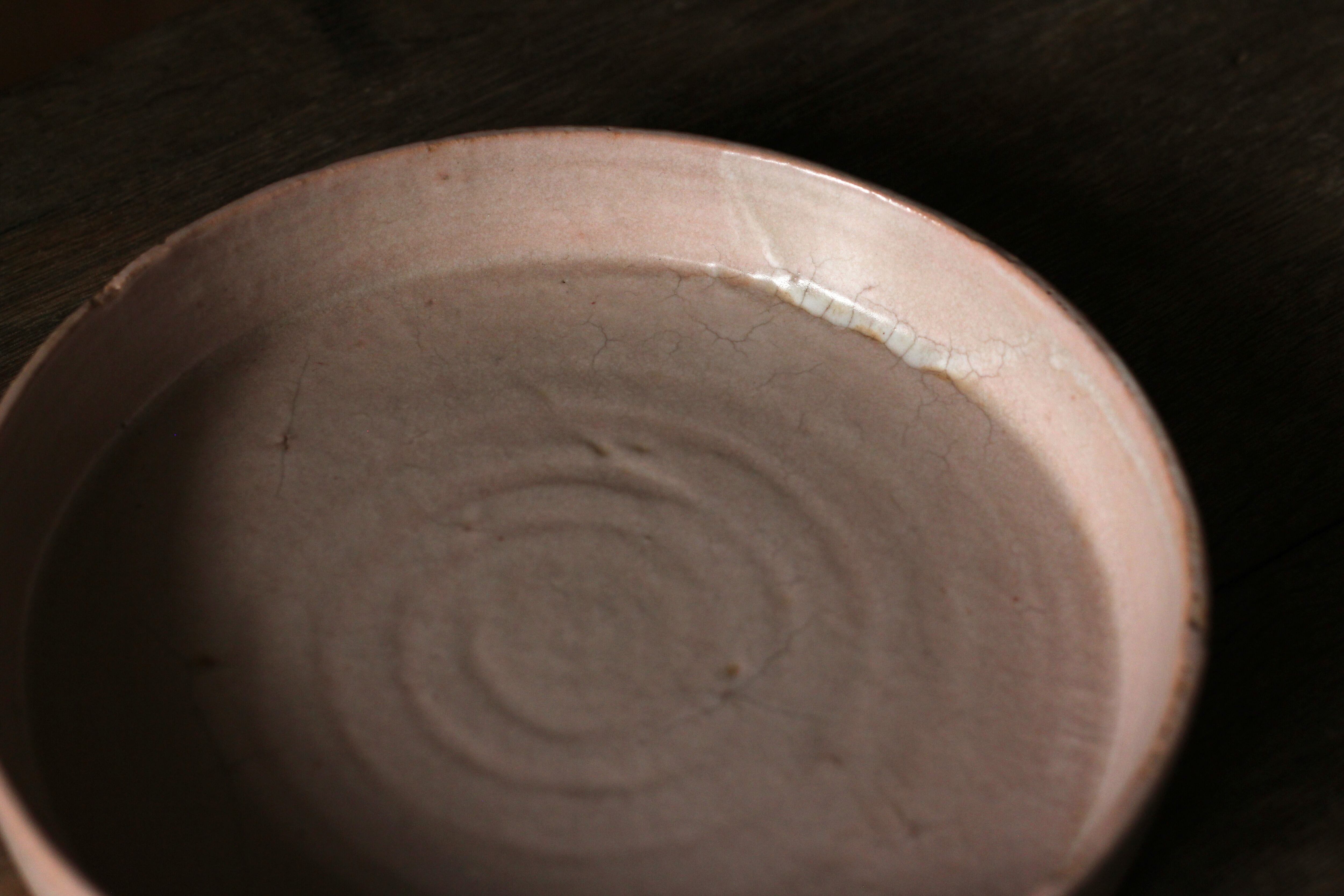 こちらは低温で焼いたあとに拭き漆を施していて、温かみのある柔らかい印象の作品に仕上がっています。ピンク色に発色する釉薬です。