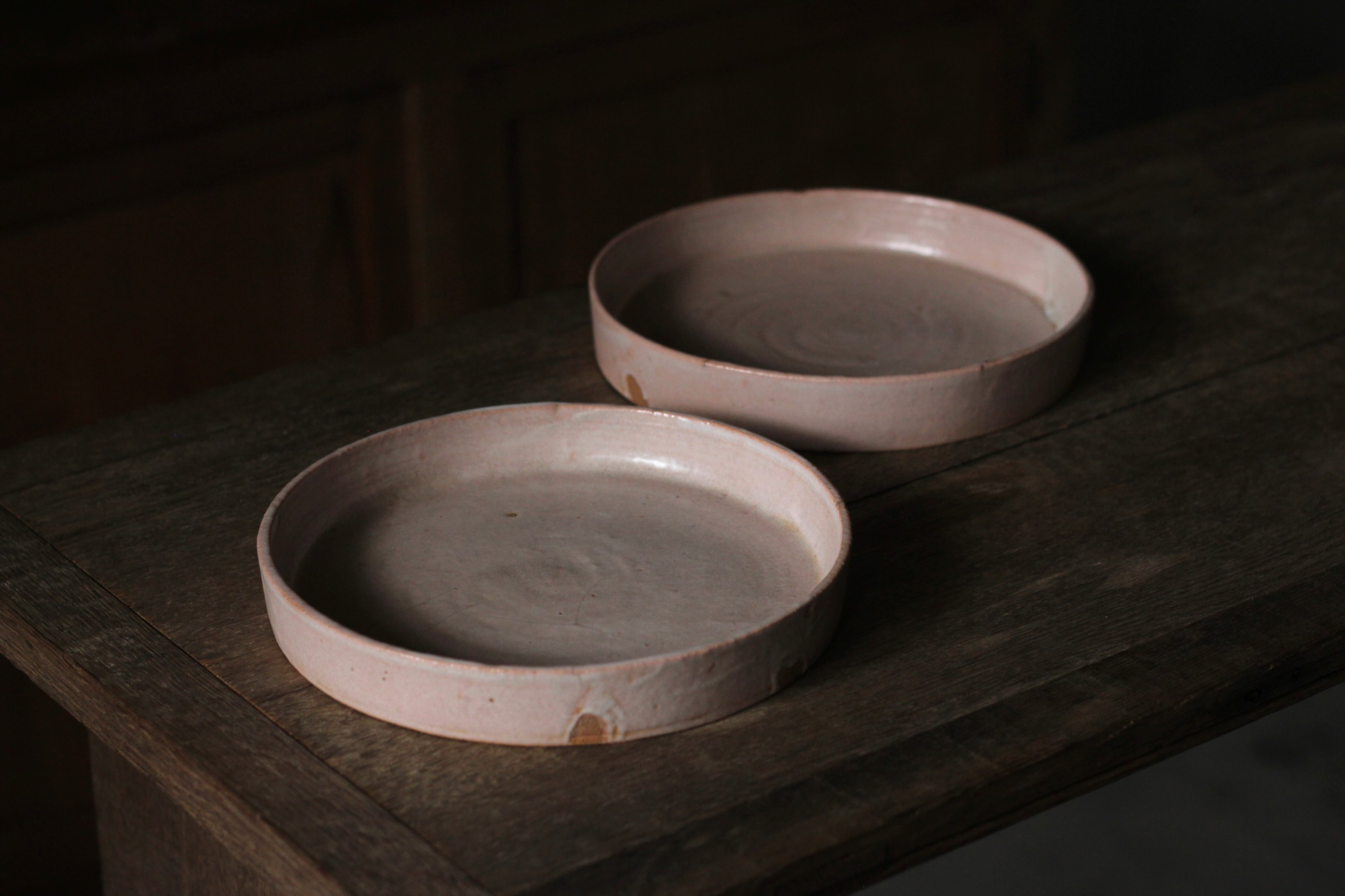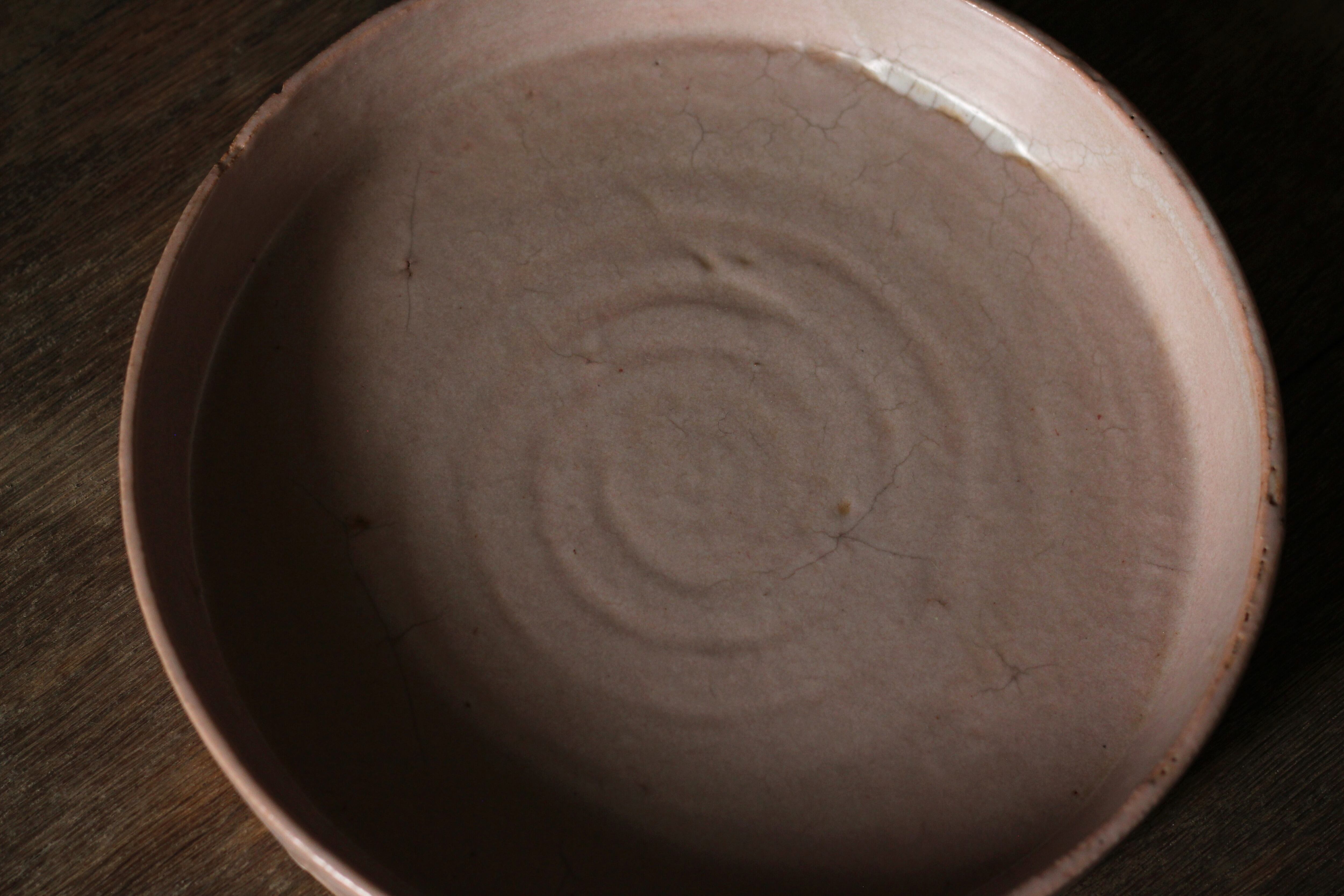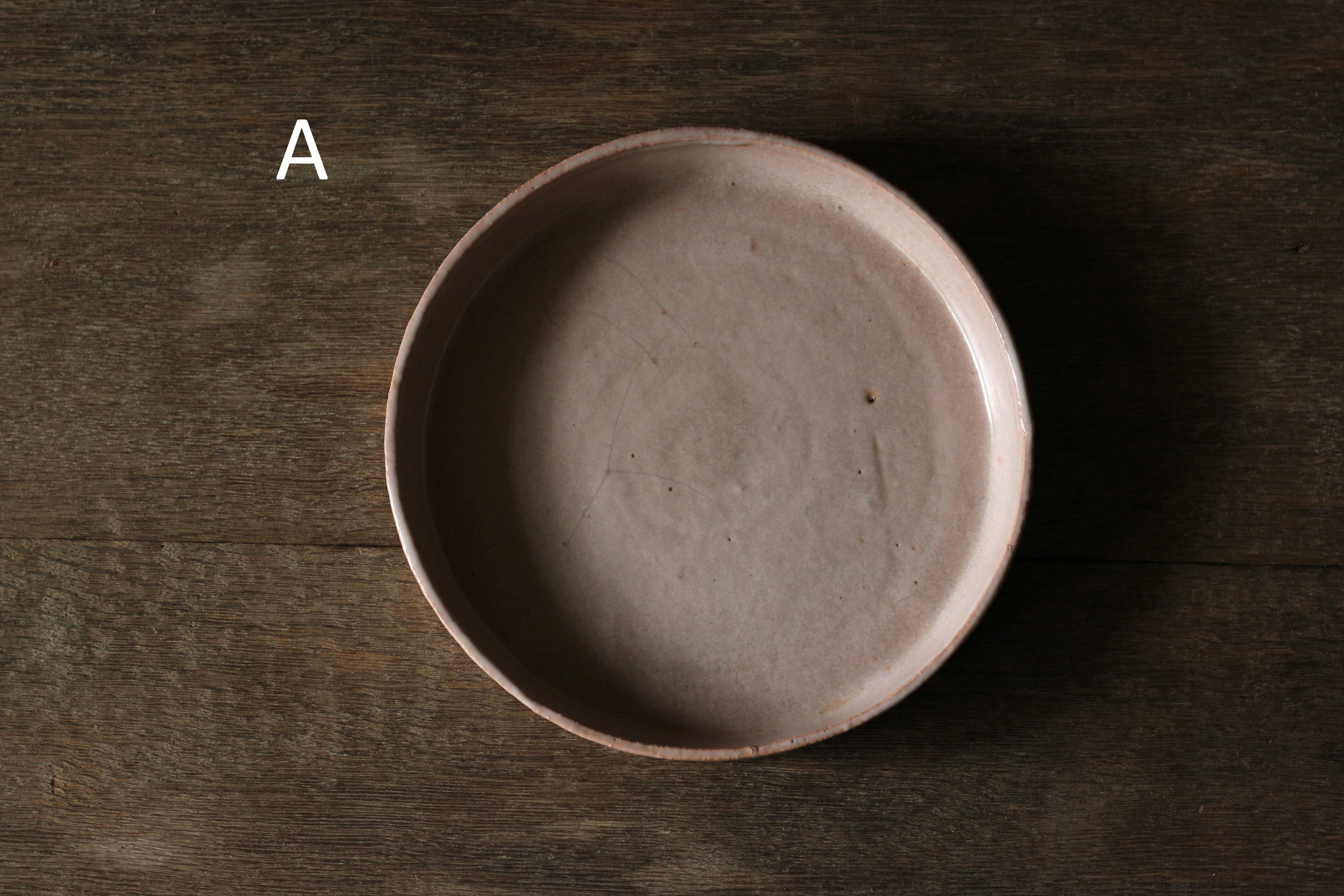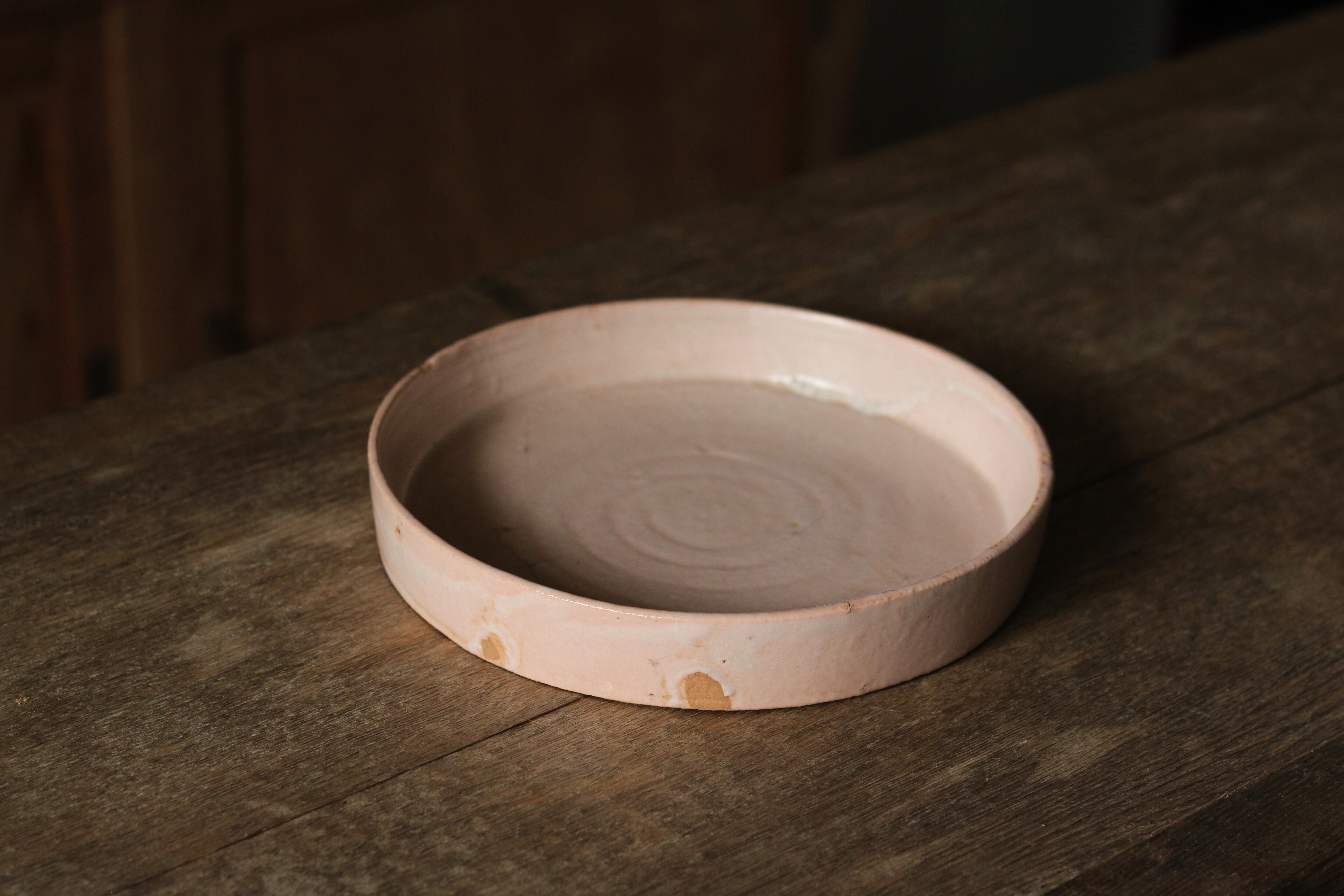 こちらは低温で焼いたあとに拭き漆を施していて、温かみのある柔らかい印象の作品に仕上がっています。ピンク色に発色する釉薬です。
