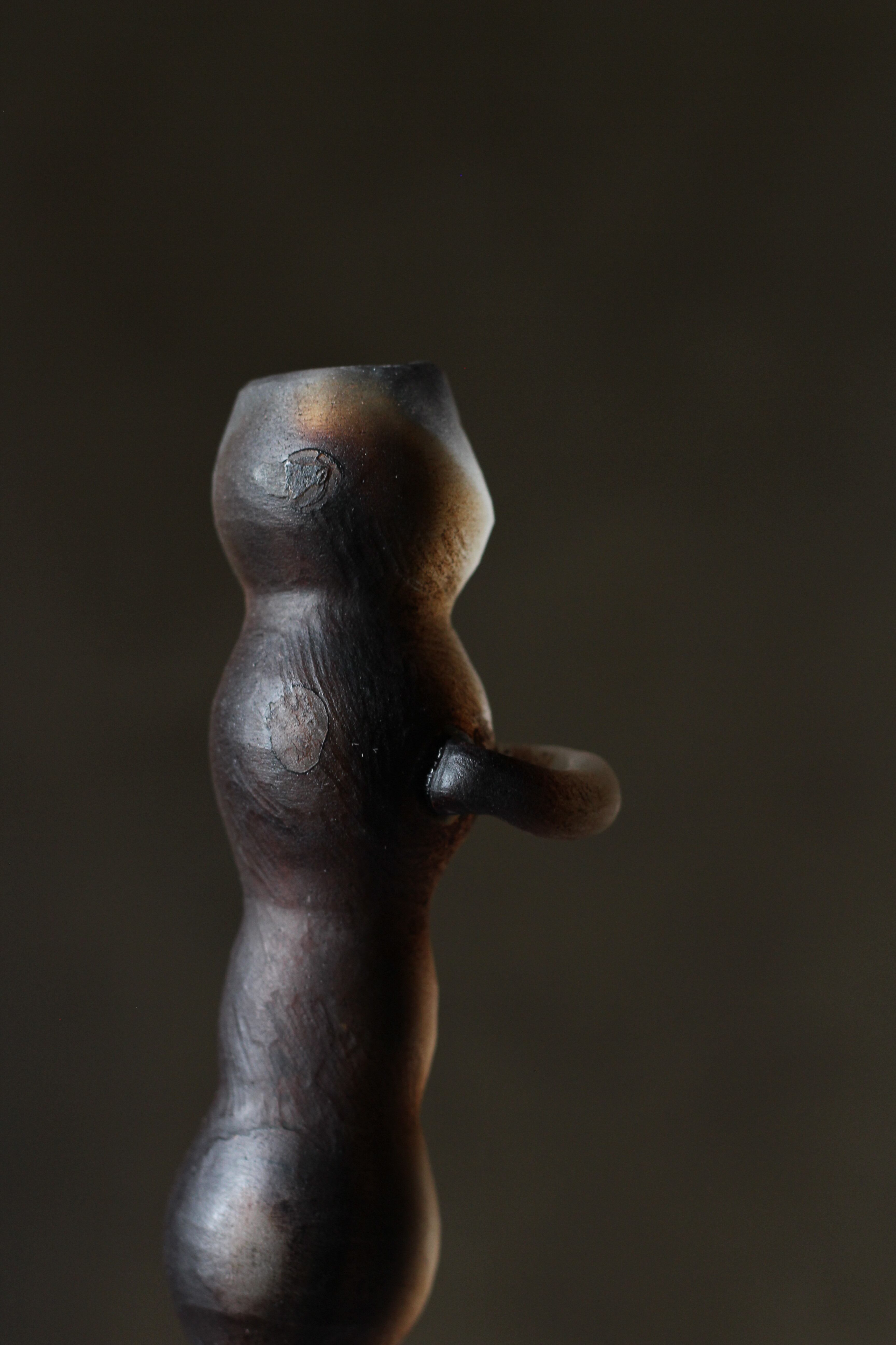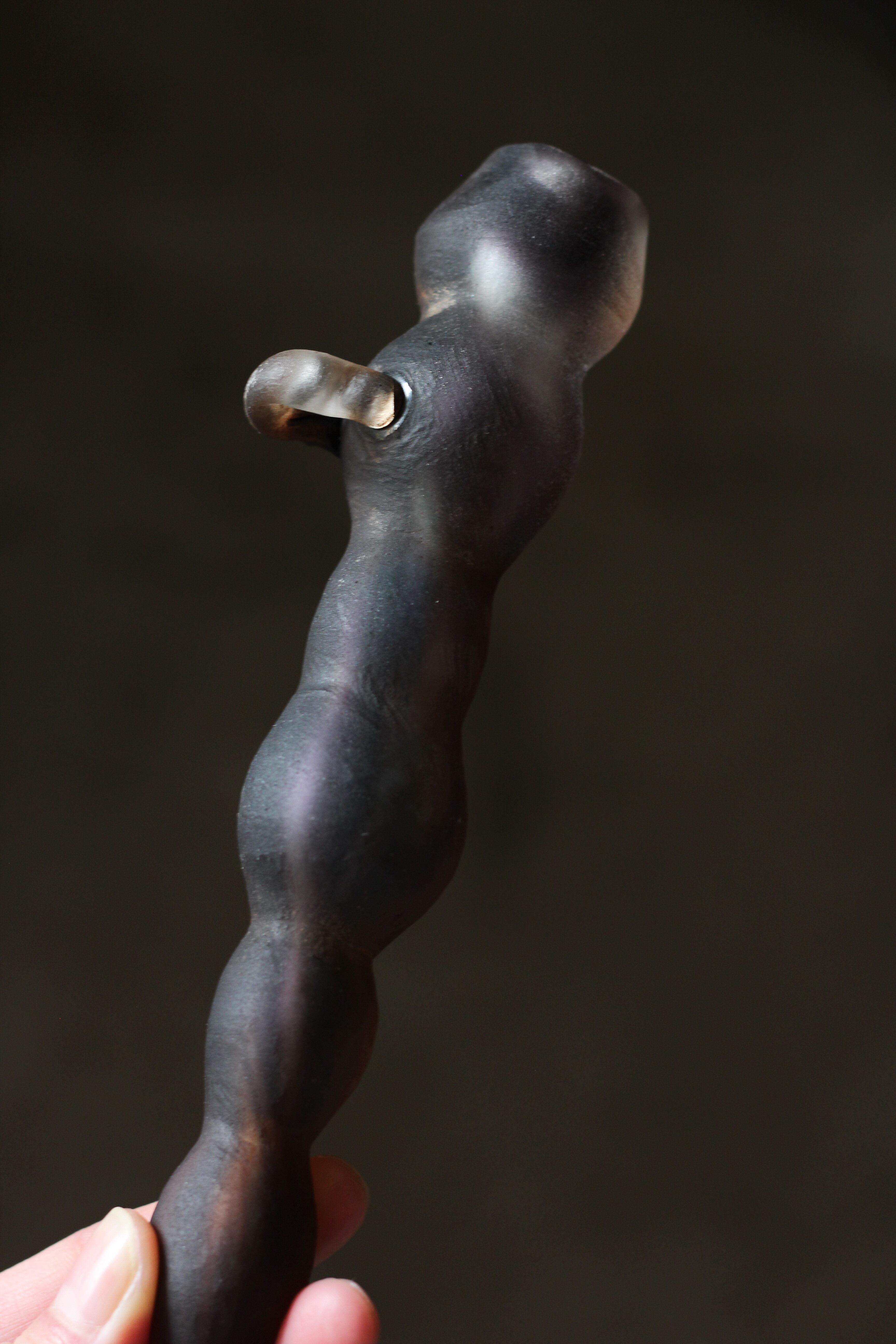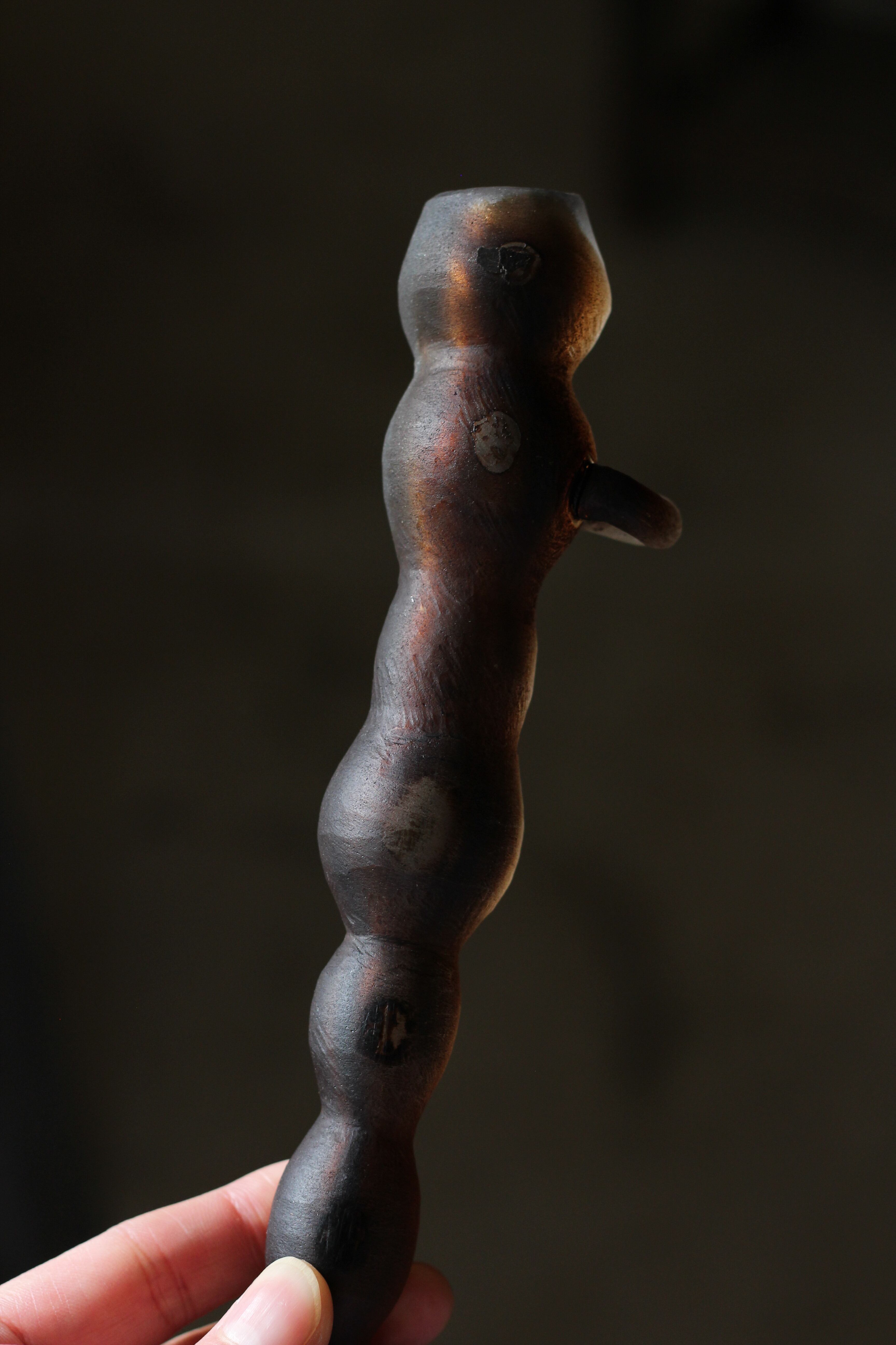 ガラスの表面に蝋を焼き付け、表面を燻らせています。その曖昧で不確かな焼き跡に、作為から離れた自然の風景を観ることがあります。燃えついた「跡」が誰かの心象風景に響く、そんな情緒的なモノを作れたらと思っています(境田さんより)。