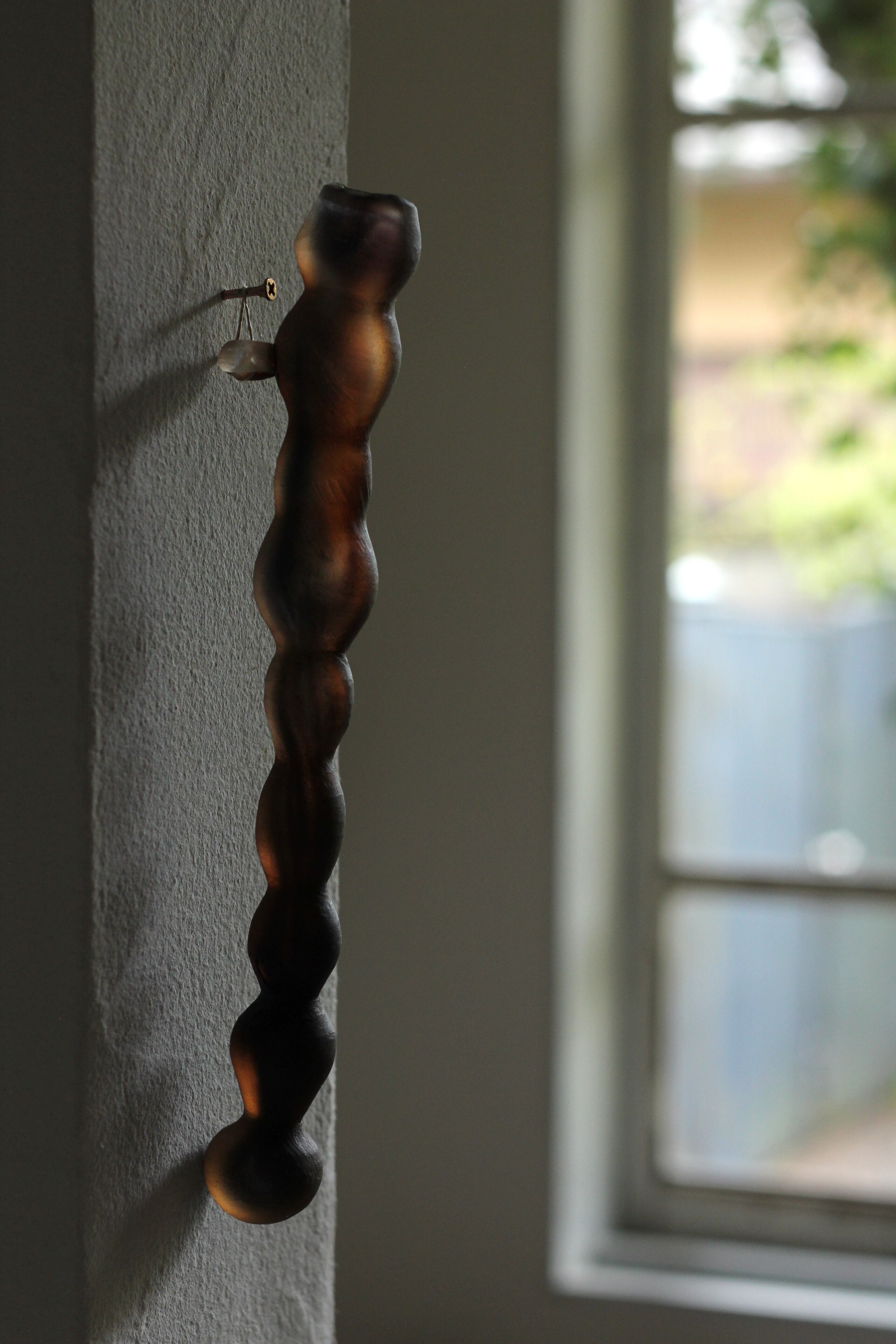 L字になっている釘ですと安定して掛けられるかと思います。一般的な釘に掛ける場合は、麻紐等を付けて掛けてください。その場合、輪は短い方が安定します。