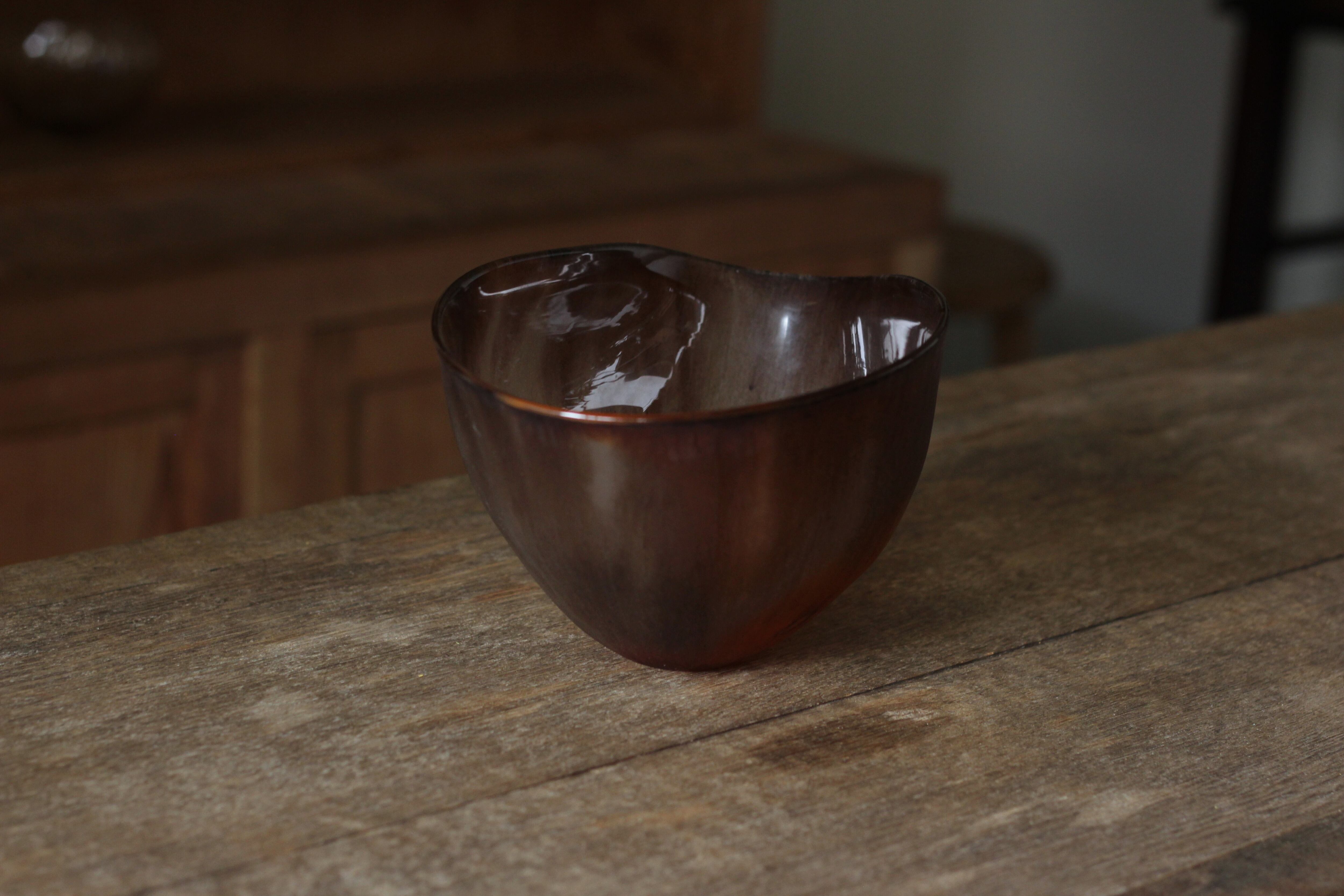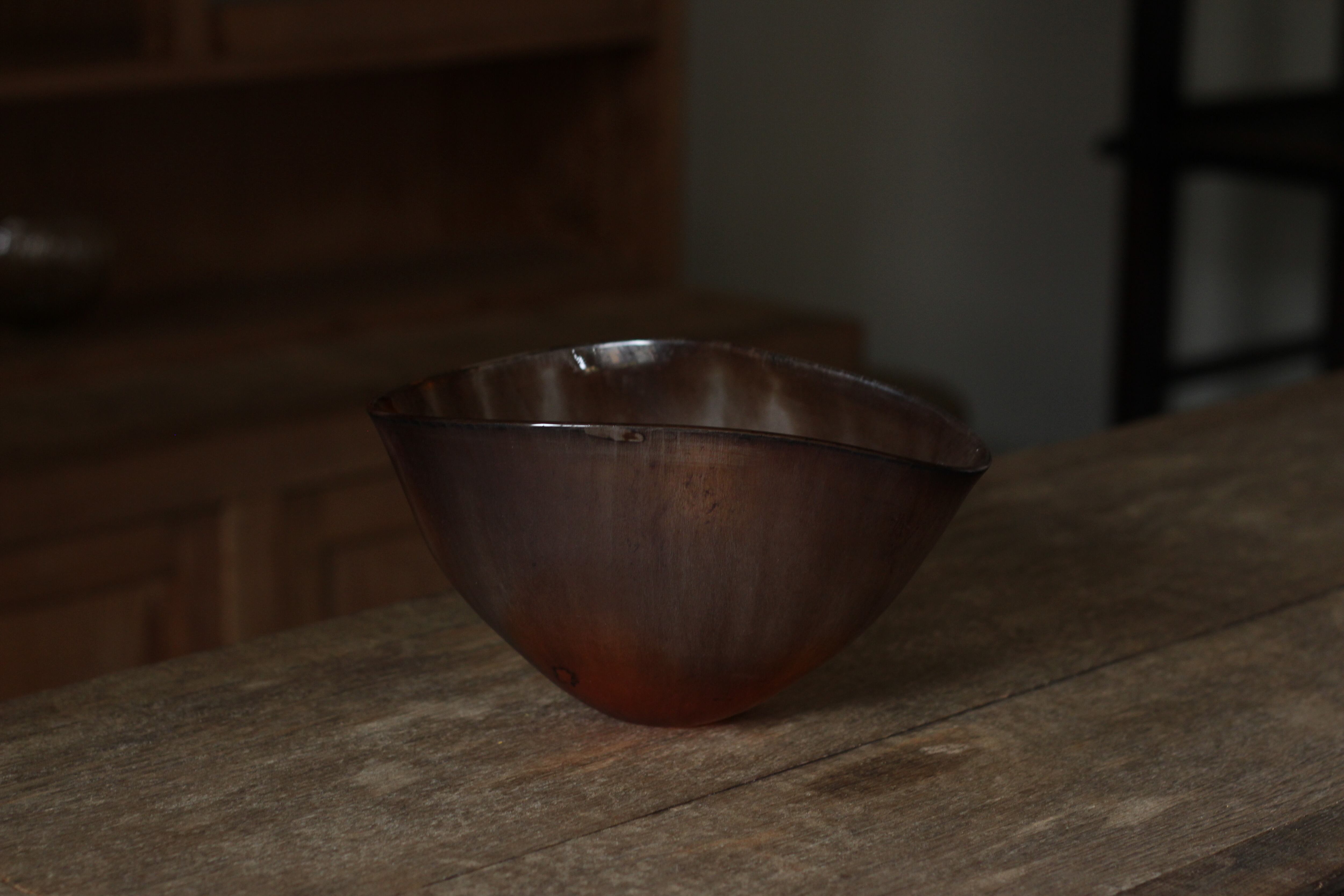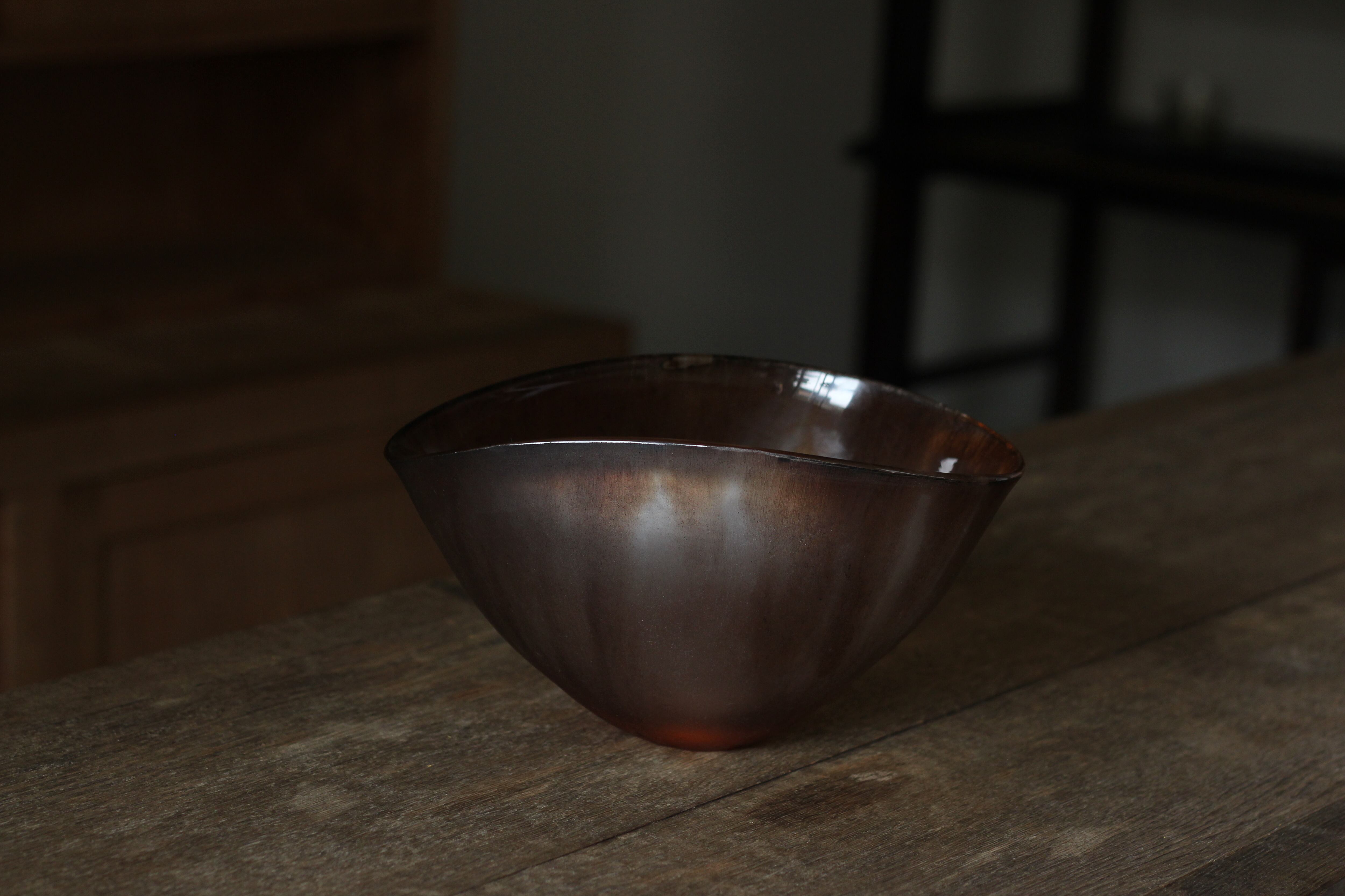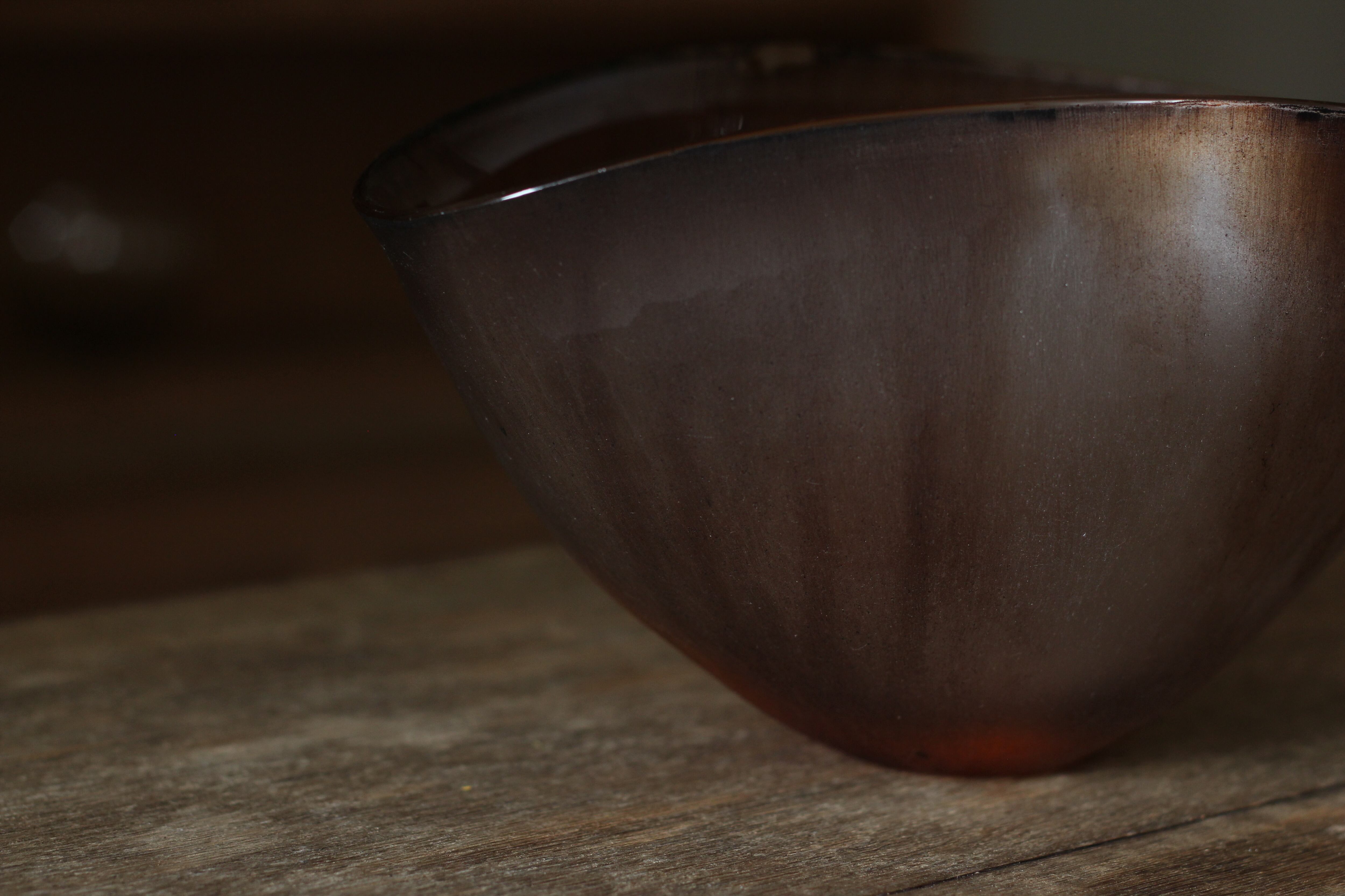 ガラスの表面に蝋を焼き付け、表面を燻らせています。その曖昧で不確かな焼き跡に、作為から離れた自然の風景を観ることがあります。燃えついた「跡」が誰かの心象風景に響く、そんな情緒的なモノを作れたらと思っています(境田さんより)。