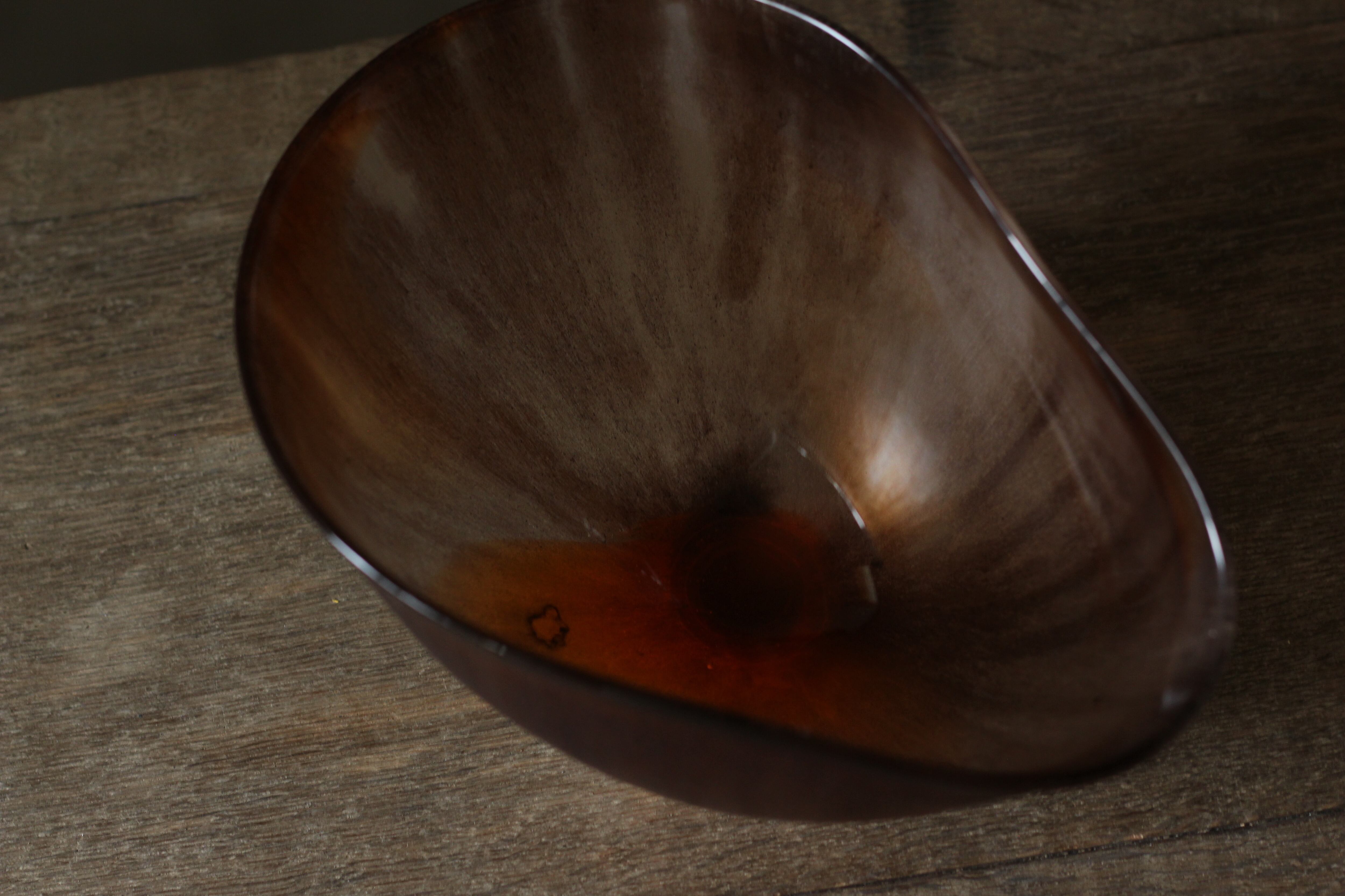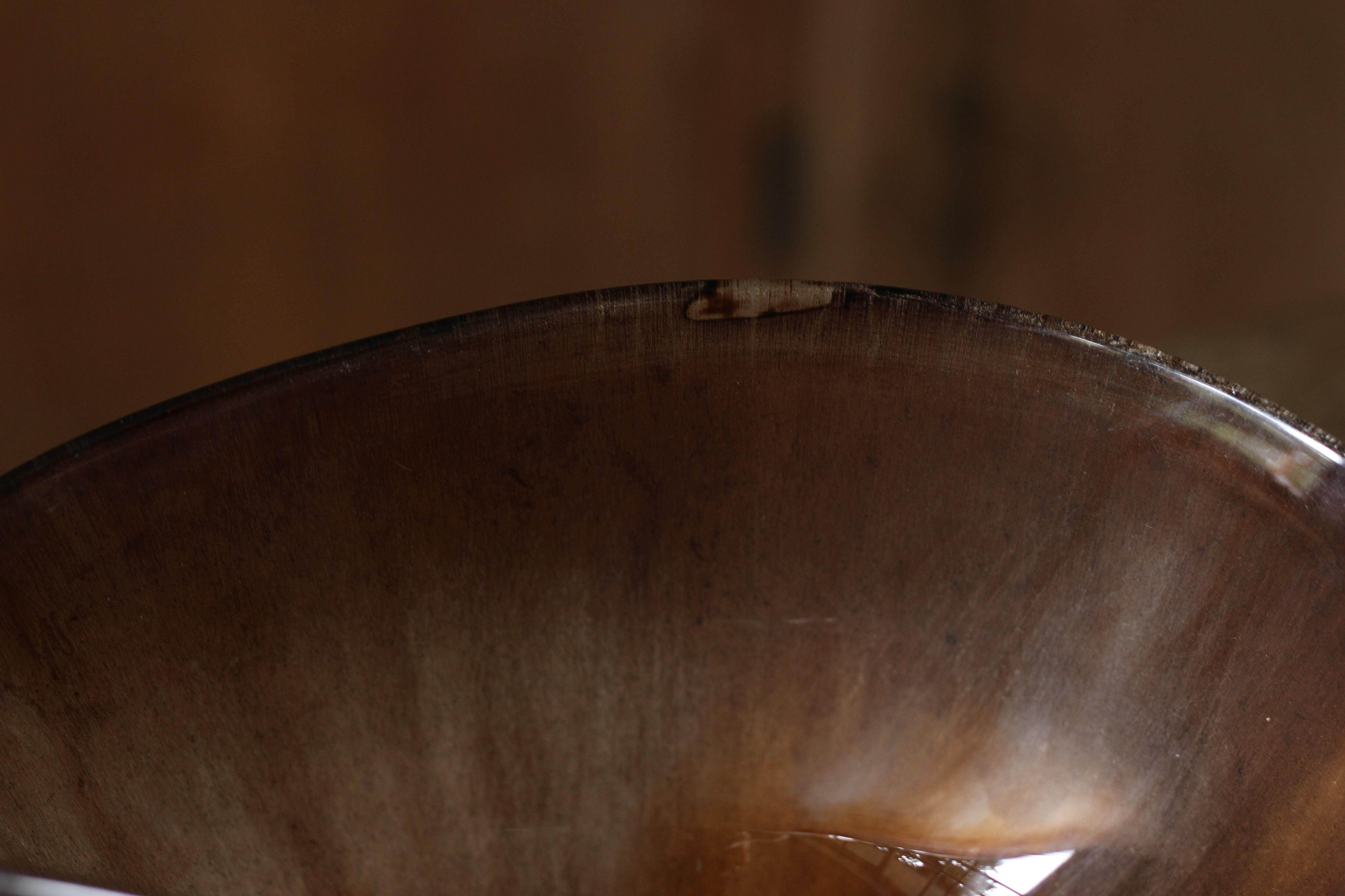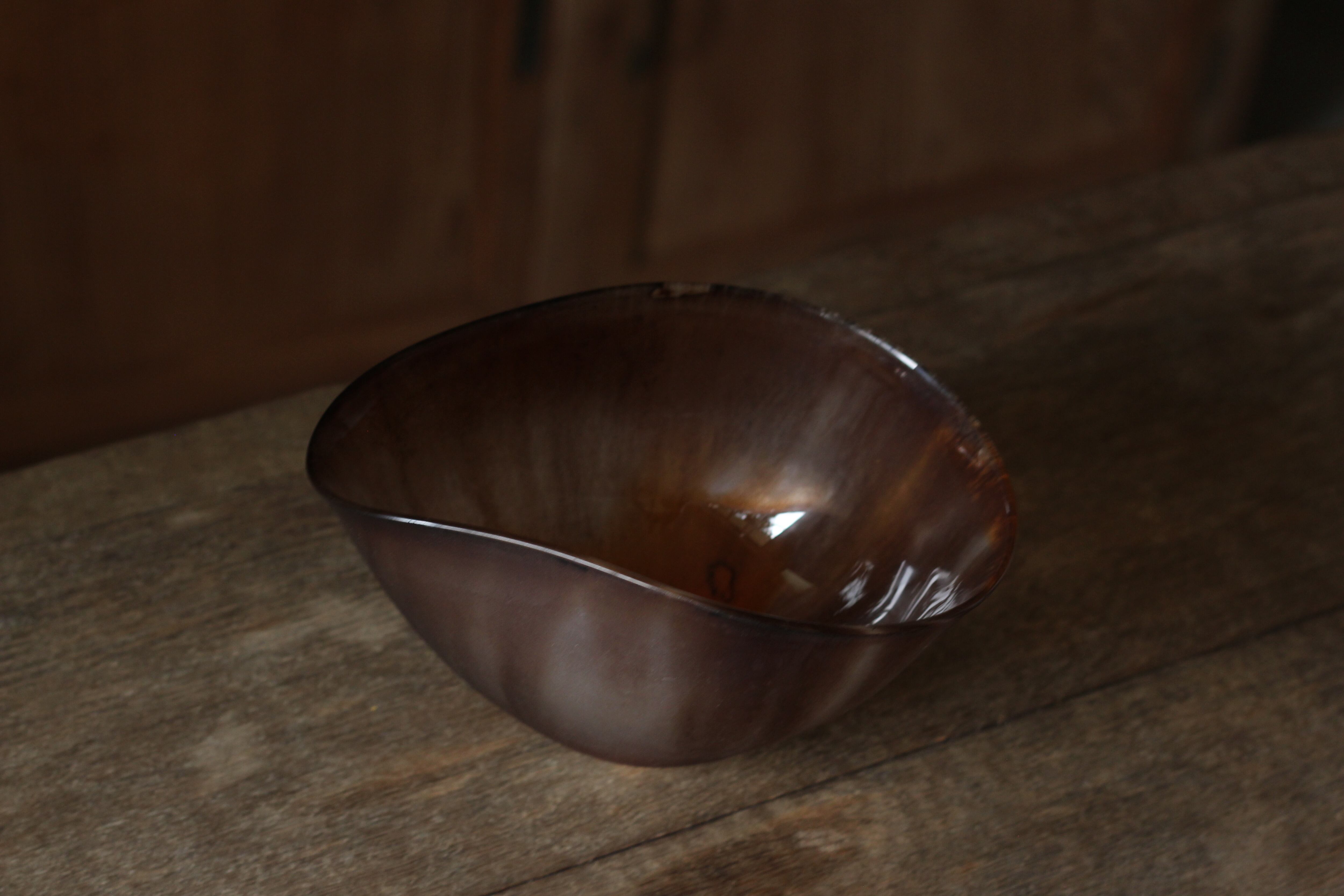 ガラスの表面に蝋を焼き付け、表面を燻らせています。その曖昧で不確かな焼き跡に、作為から離れた自然の風景を観ることがあります。燃えついた「跡」が誰かの心象風景に響く、そんな情緒的なモノを作れたらと思っています(境田さんより)。