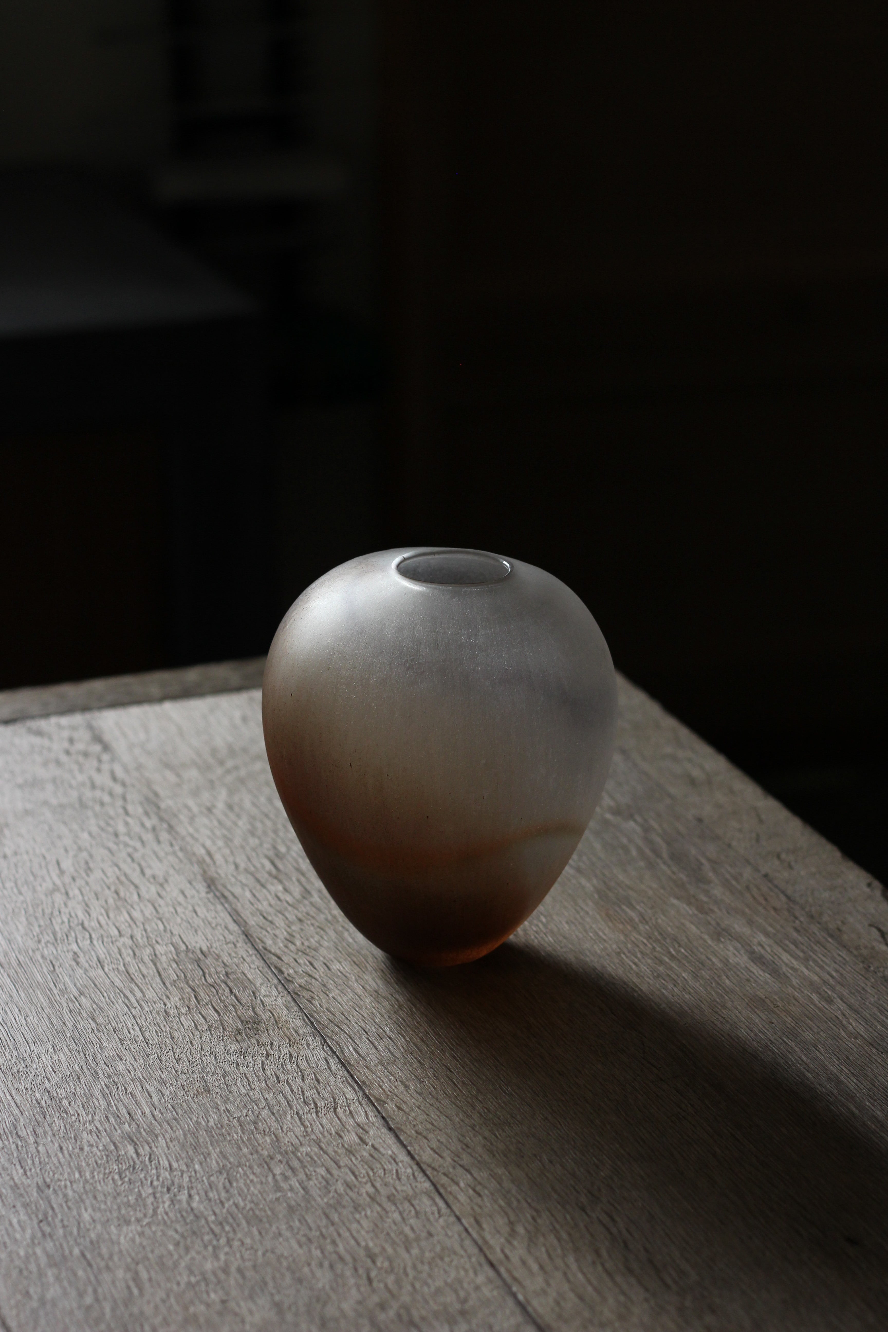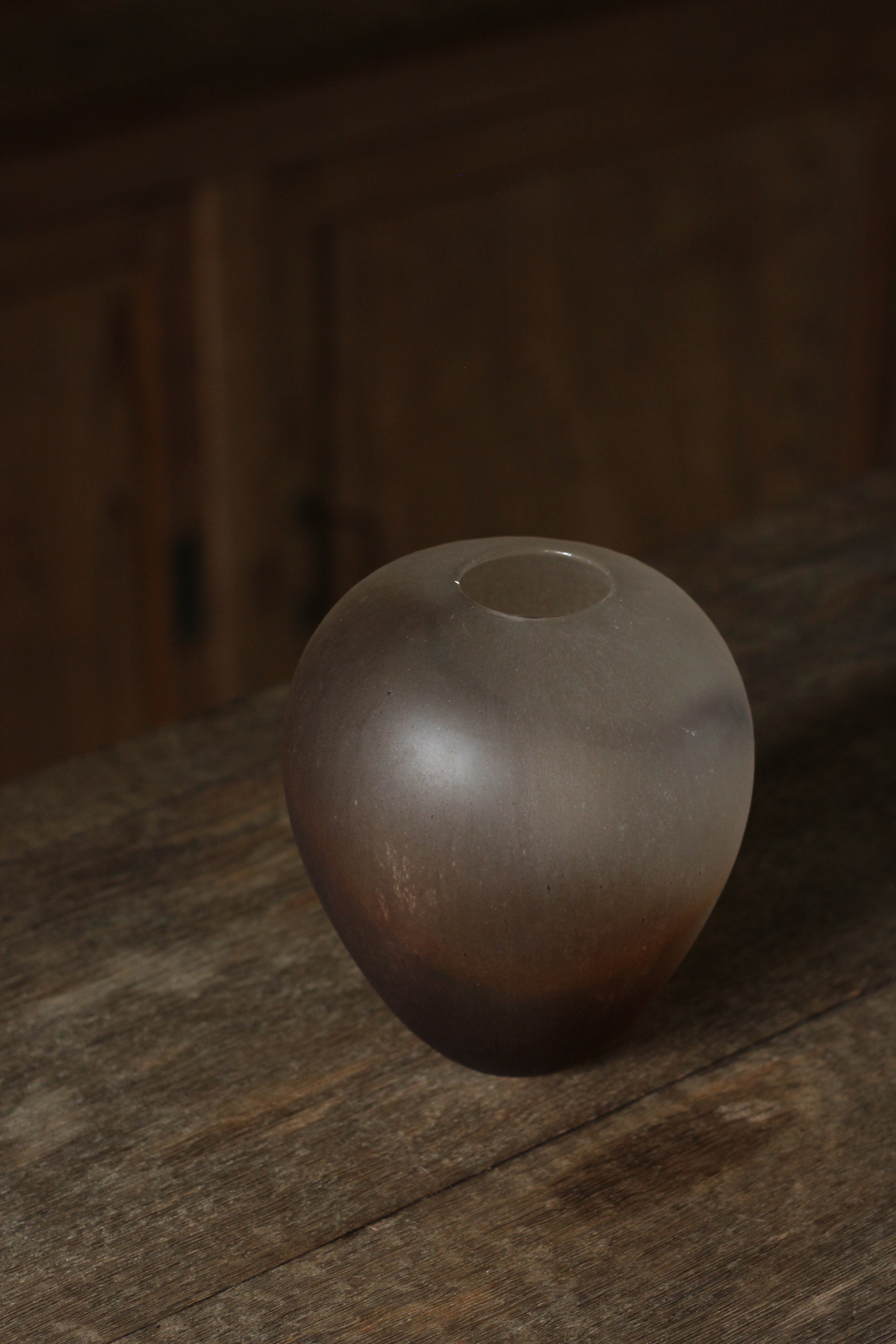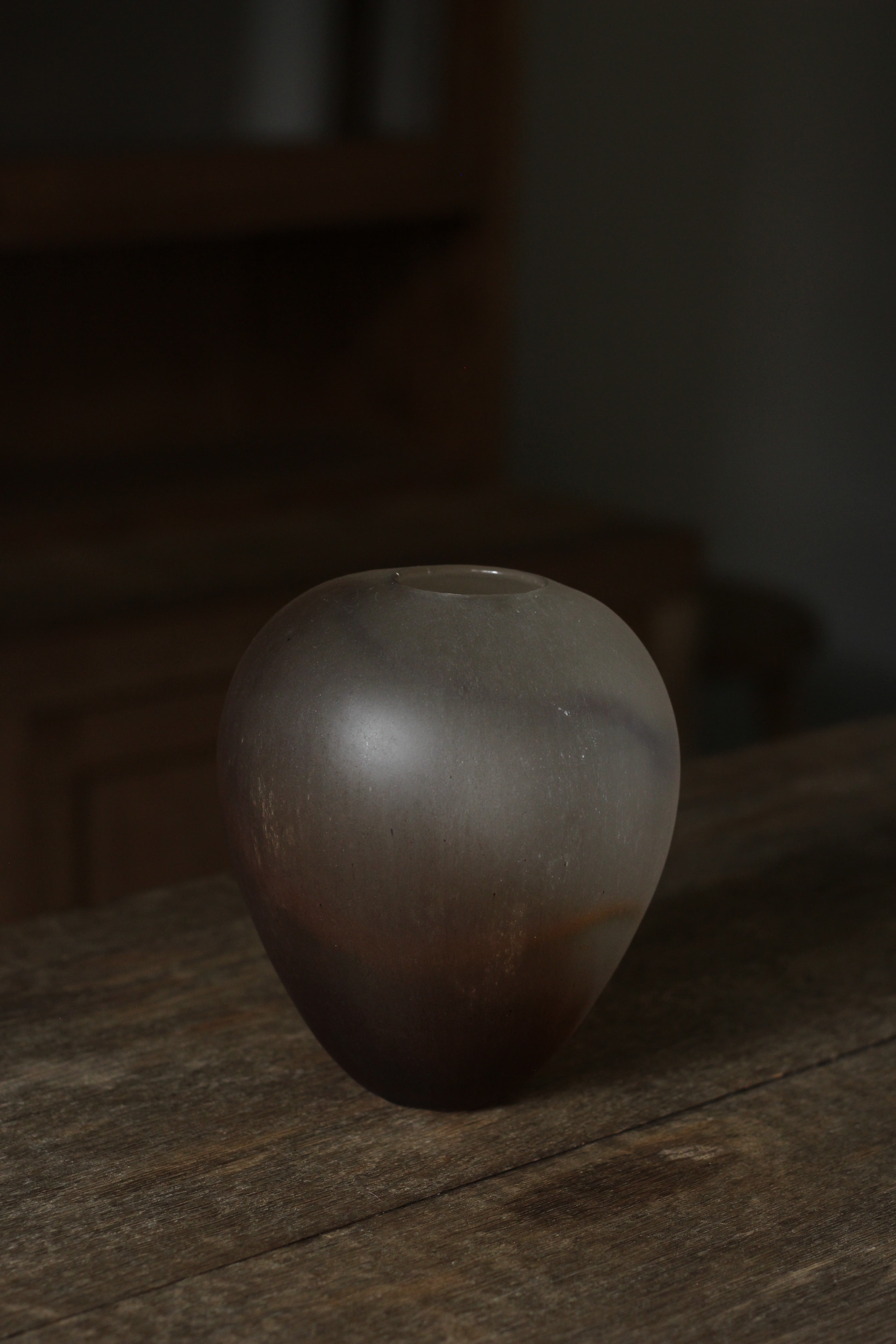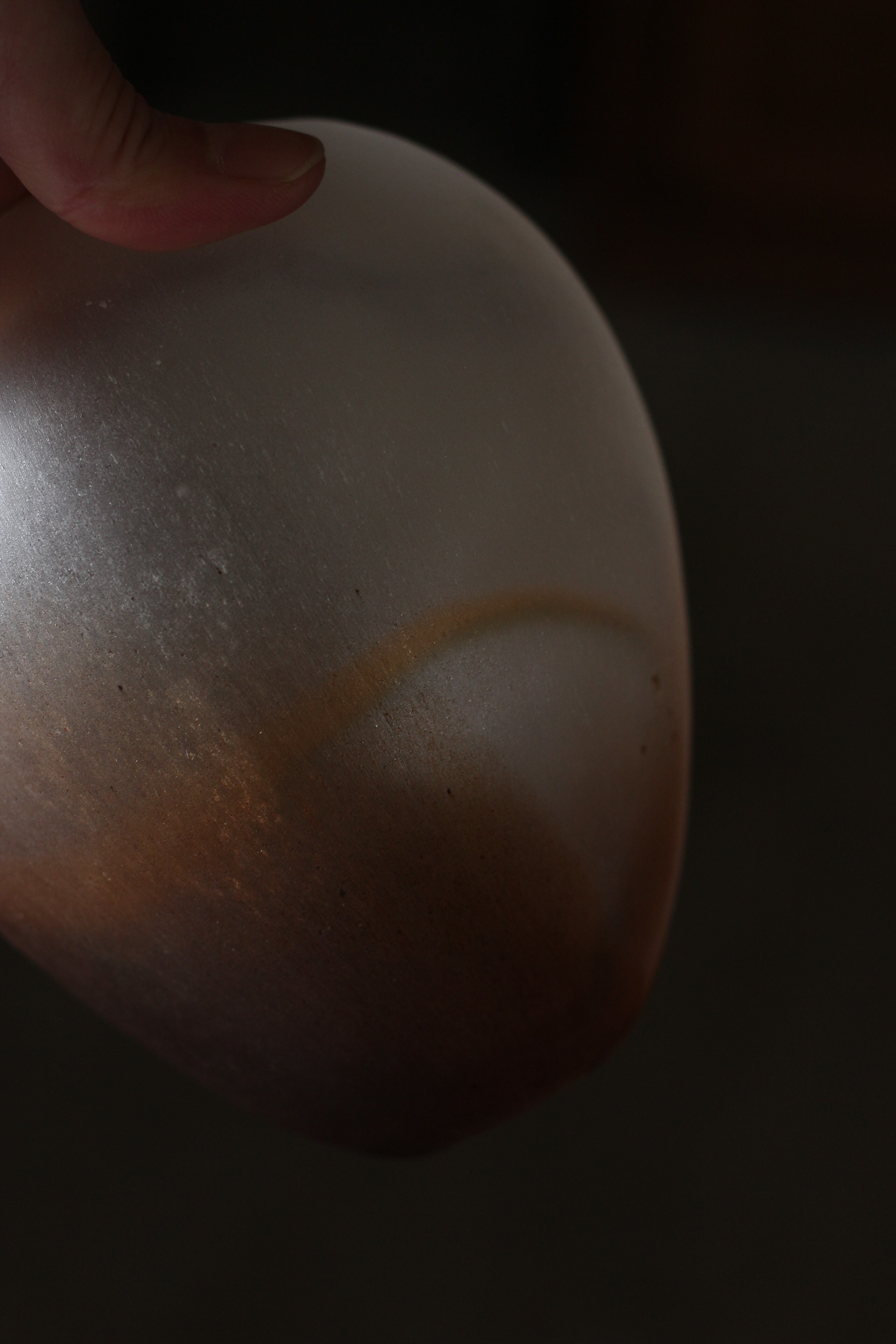 ガラスの表面に蝋を焼き付け、表面を燻らせています。その曖昧で不確かな焼き跡に、作為から離れた自然の風景を観ることがあります。燃えついた「跡」が誰かの心象風景に響く、そんな情緒的なモノを作れたらと思っています(境田さんより)。