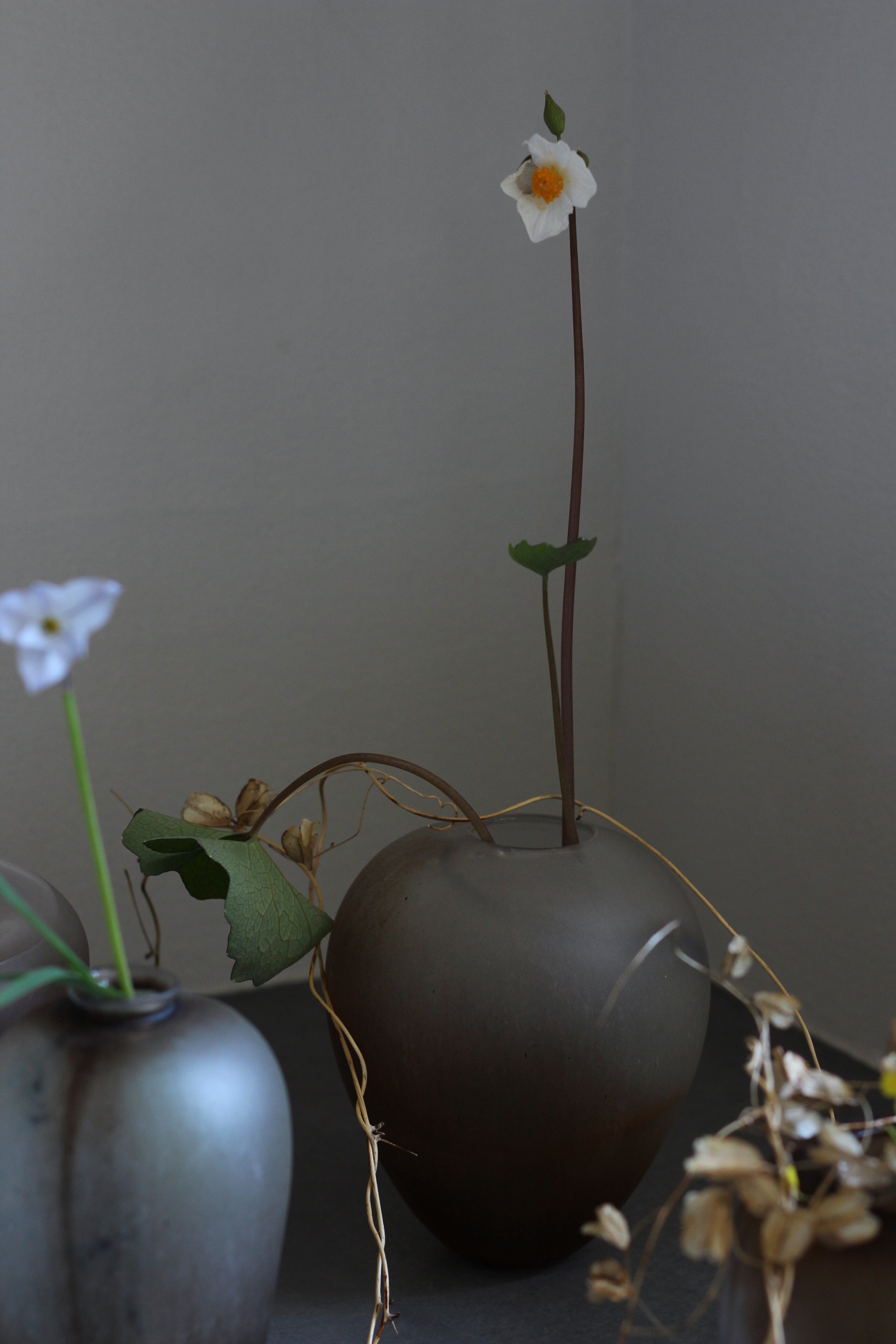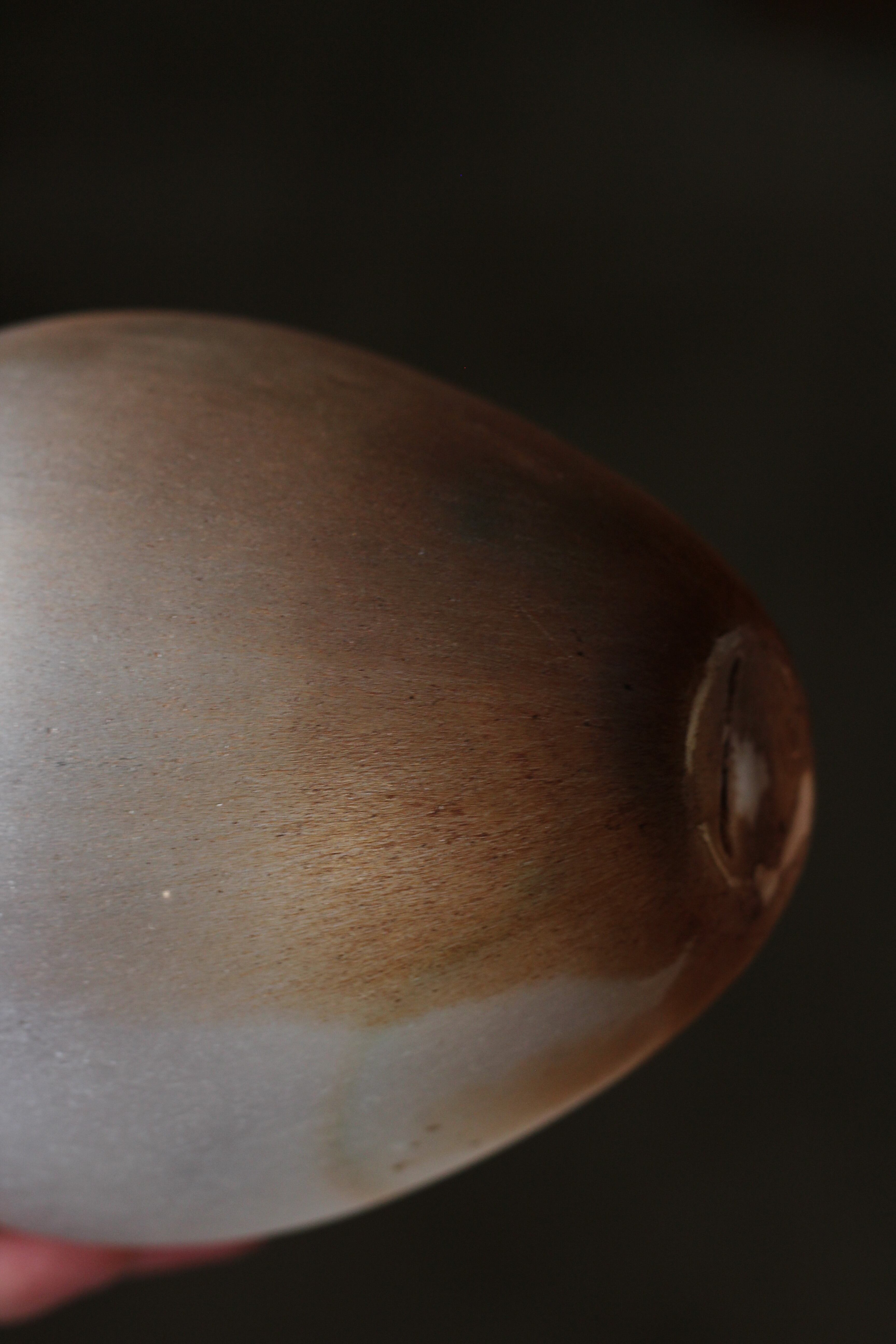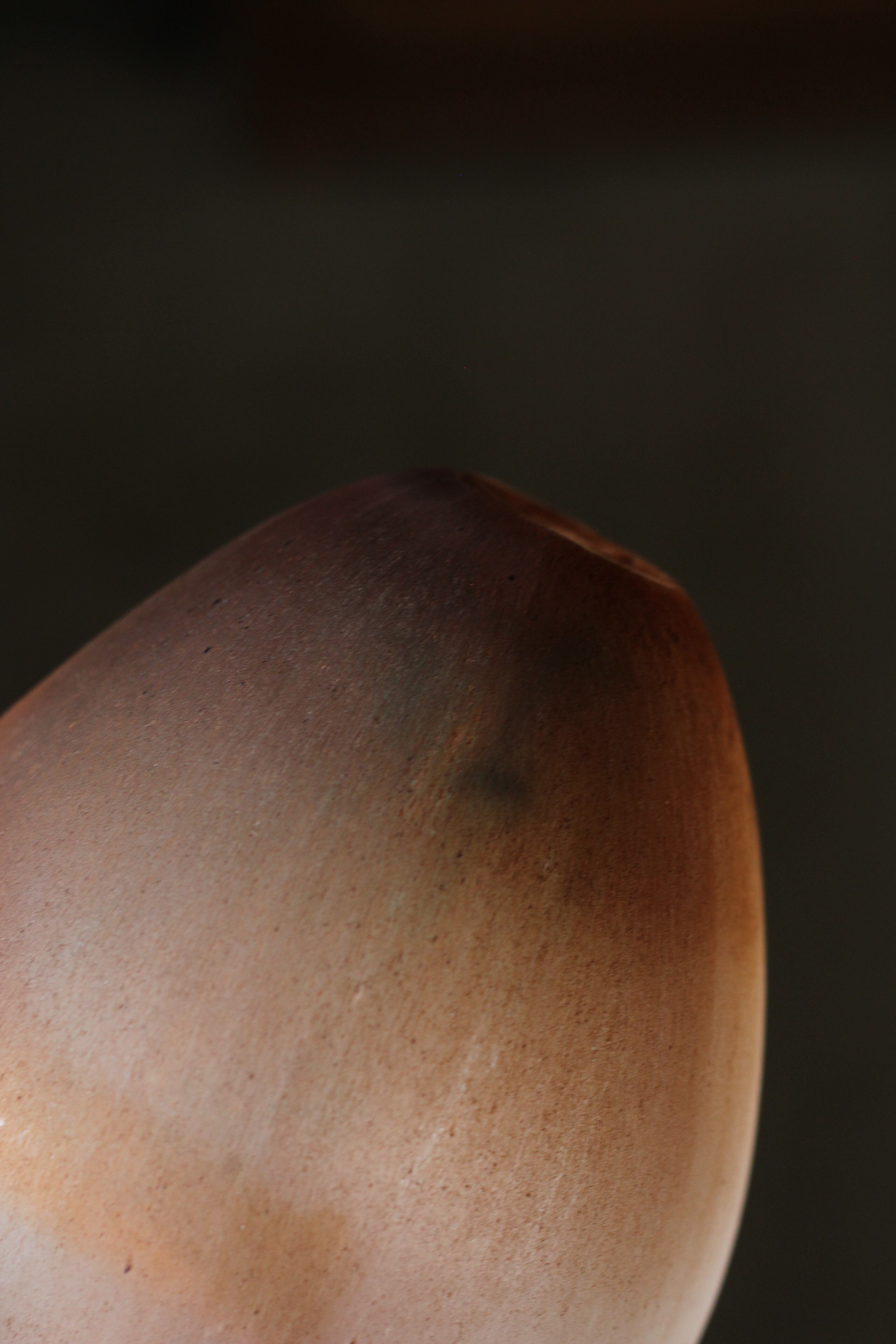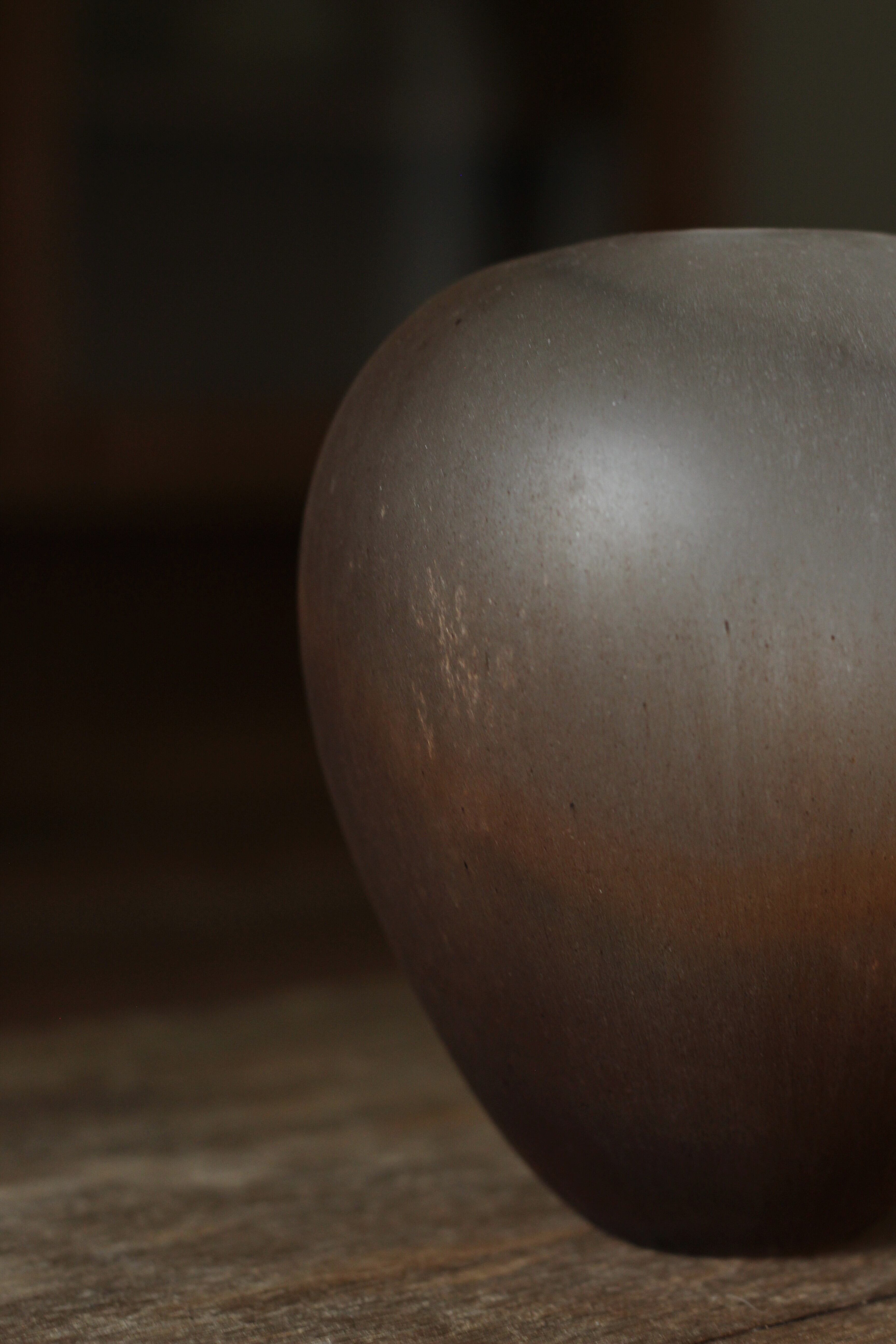ガラスの表面に蝋を焼き付け、表面を燻らせています。その曖昧で不確かな焼き跡に、作為から離れた自然の風景を観ることがあります。燃えついた「跡」が誰かの心象風景に響く、そんな情緒的なモノを作れたらと思っています(境田さんより)。