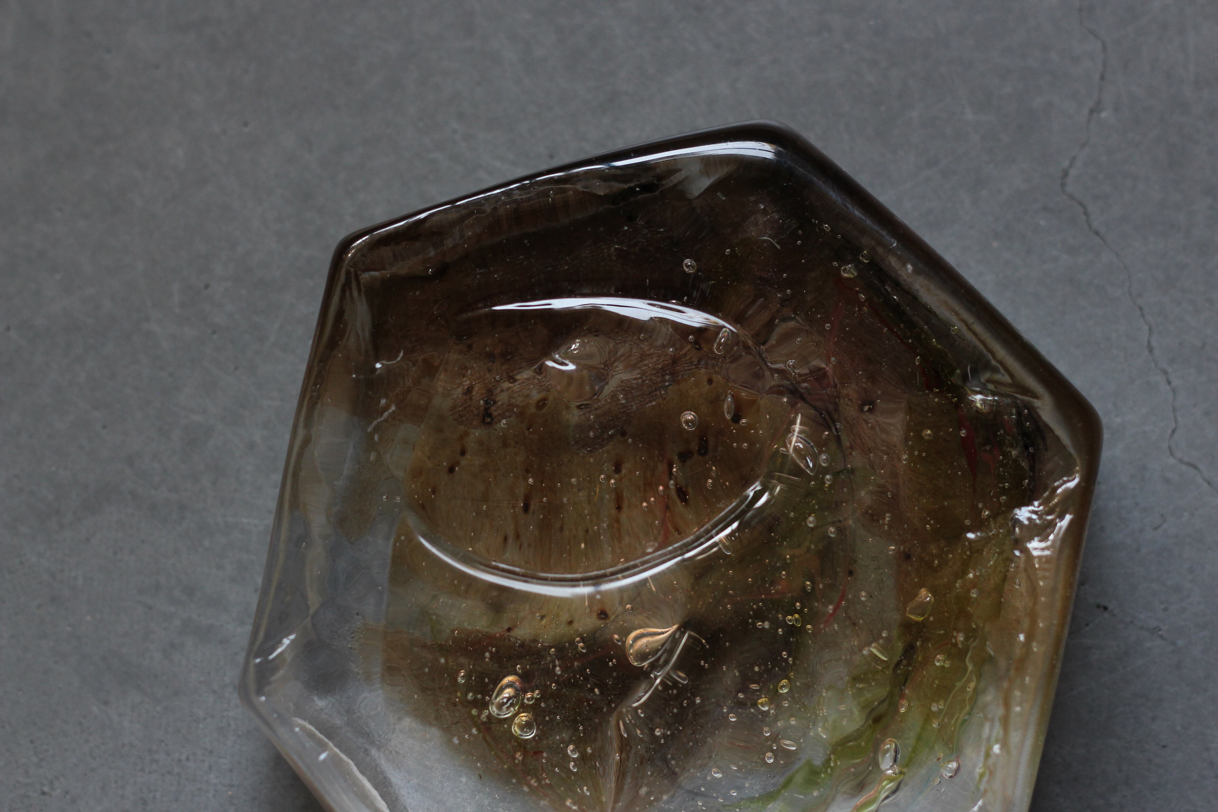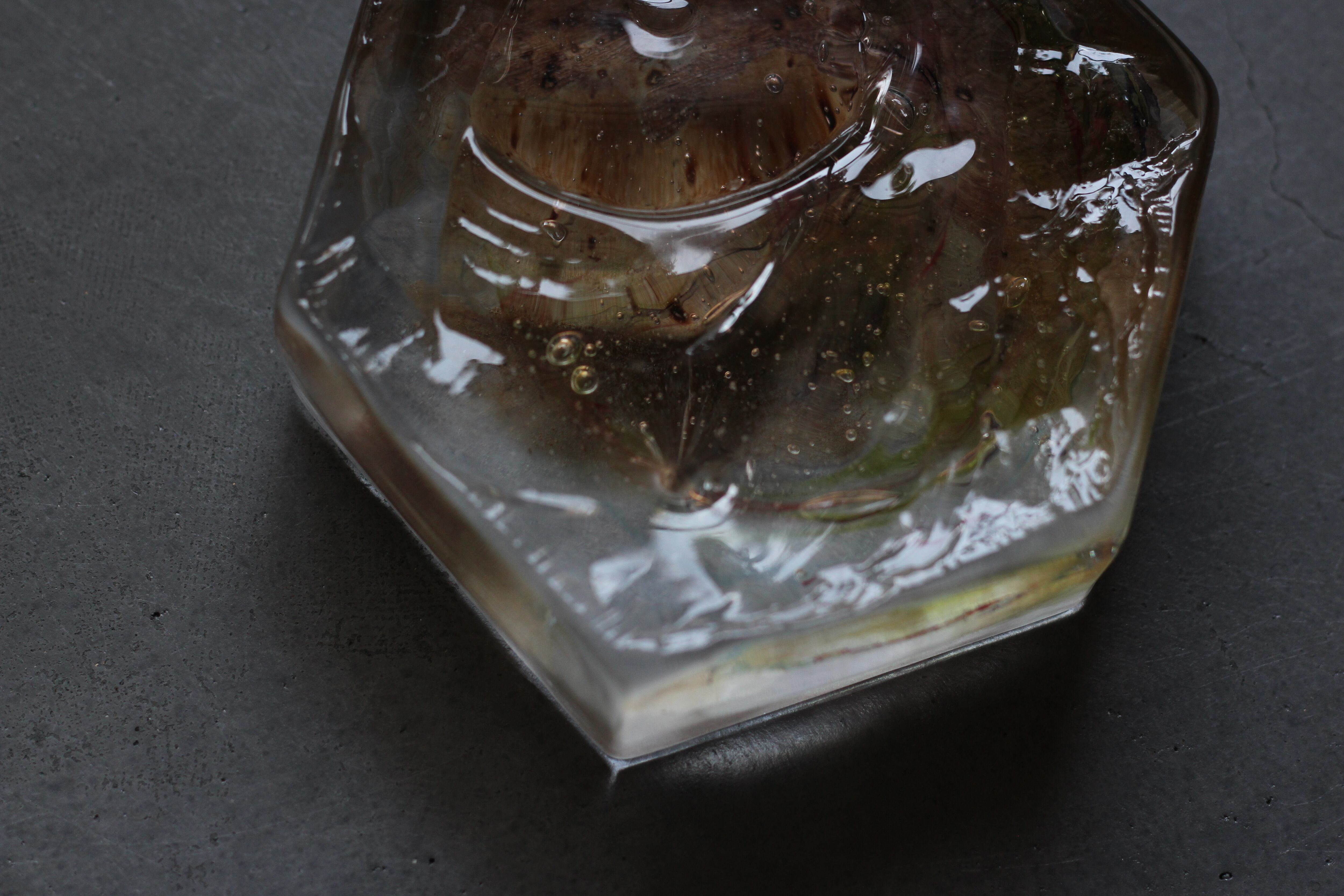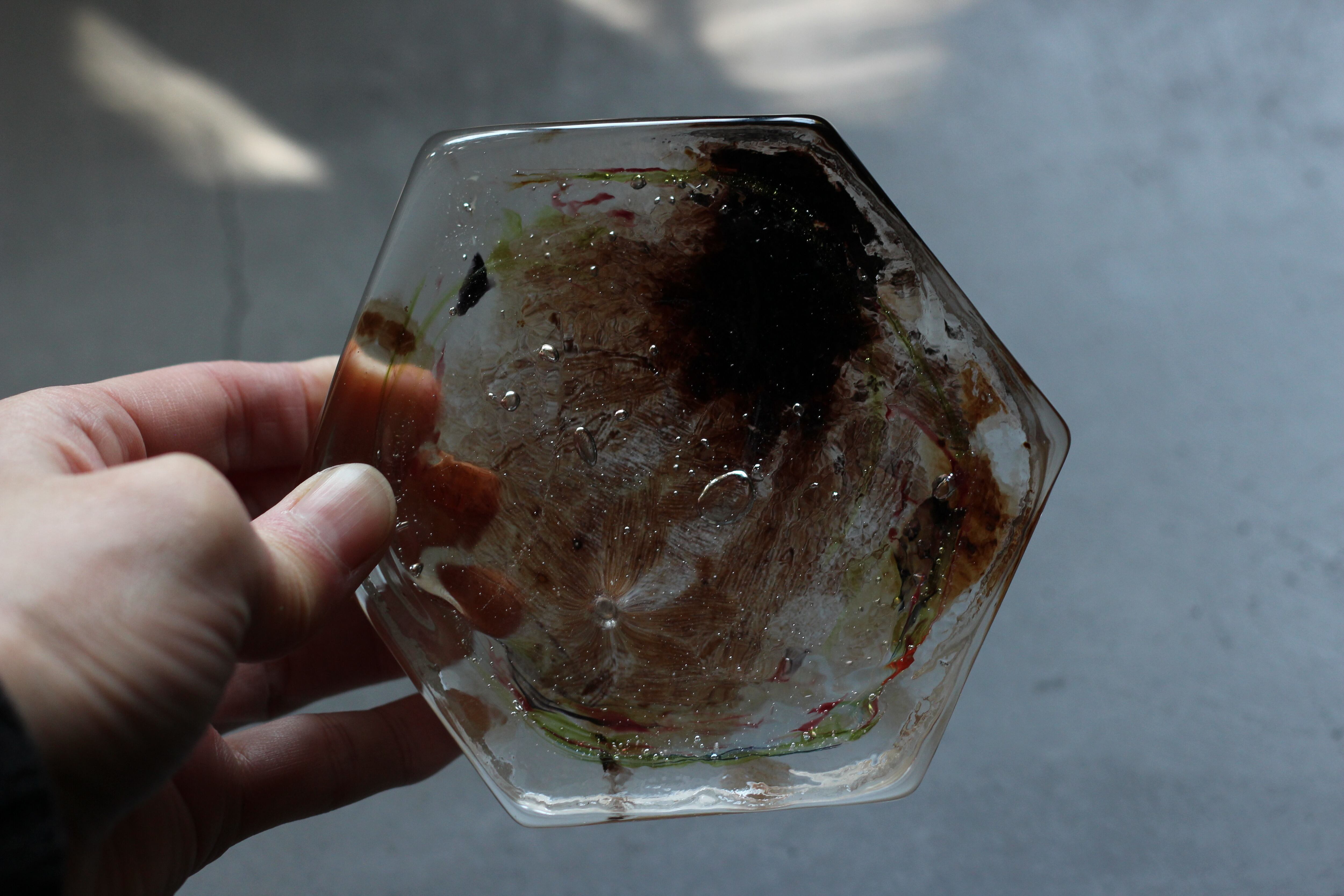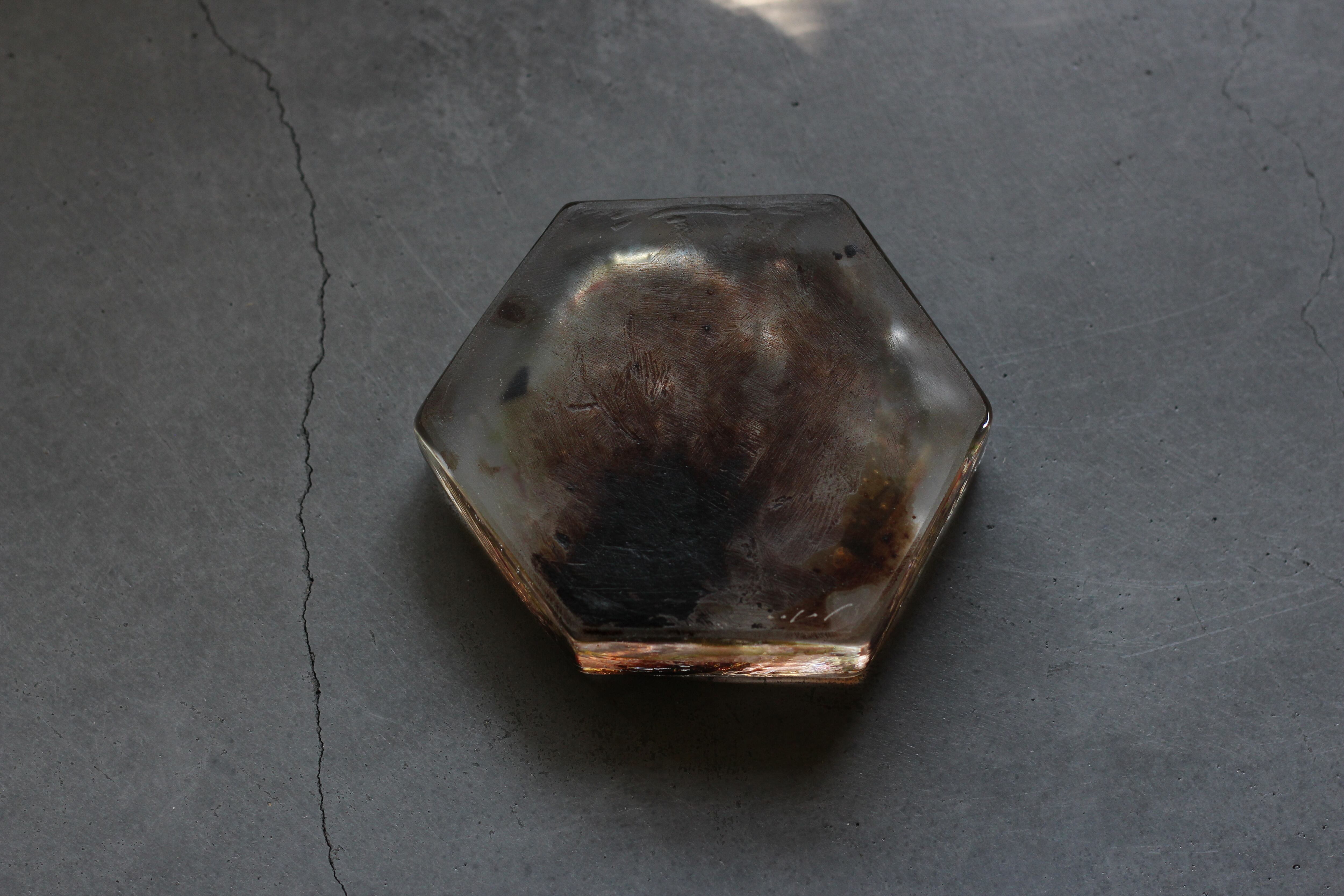 ガラスの表面に蝋を焼き付け、表面を燻らせています。その曖昧で不確かな焼き跡に、作為から離れた自然の風景を観ることがあります。燃えついた「跡」が誰かの心象風景に響く、そんな情緒的なモノを作れたらと思っています(境田さんより)。