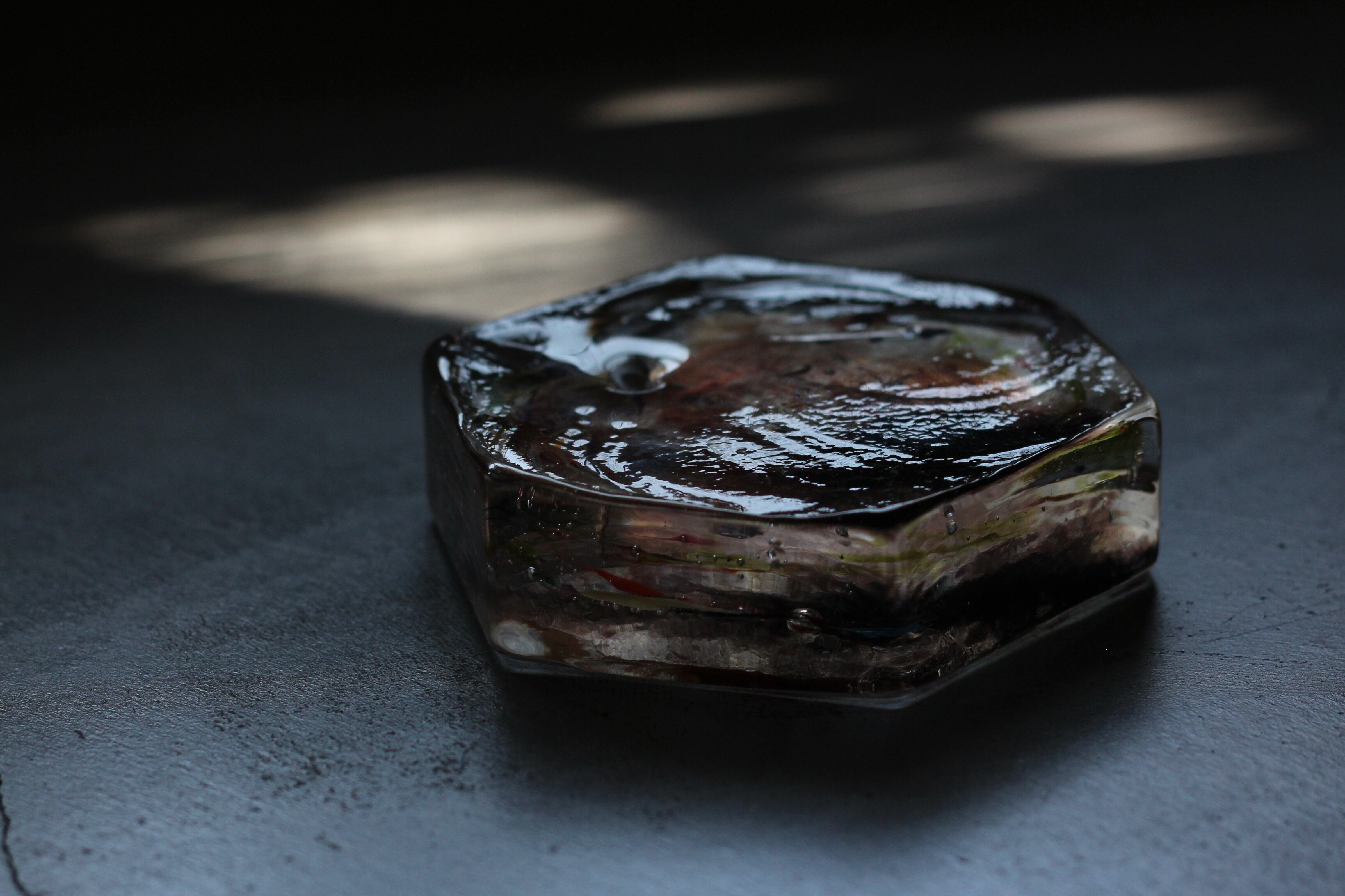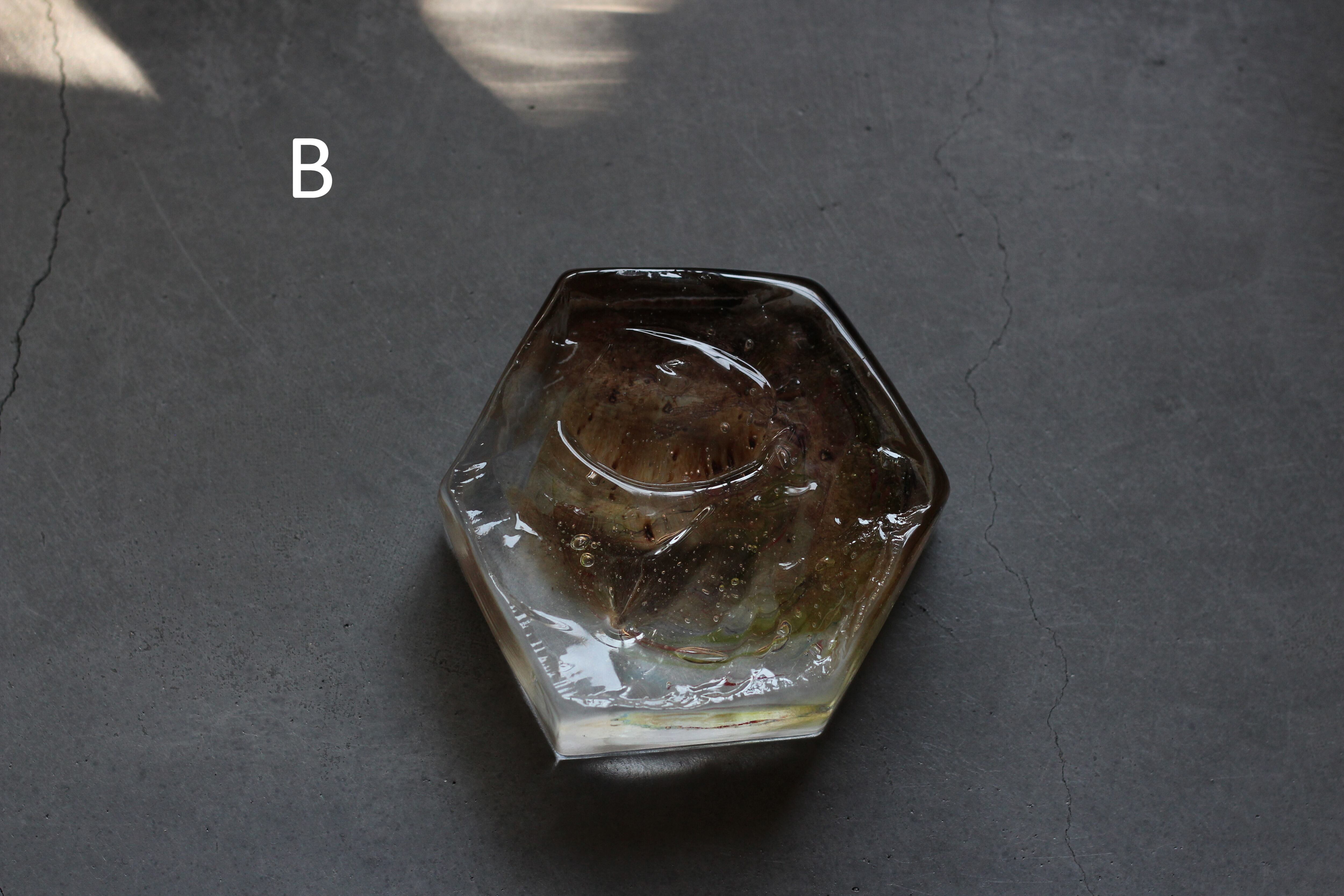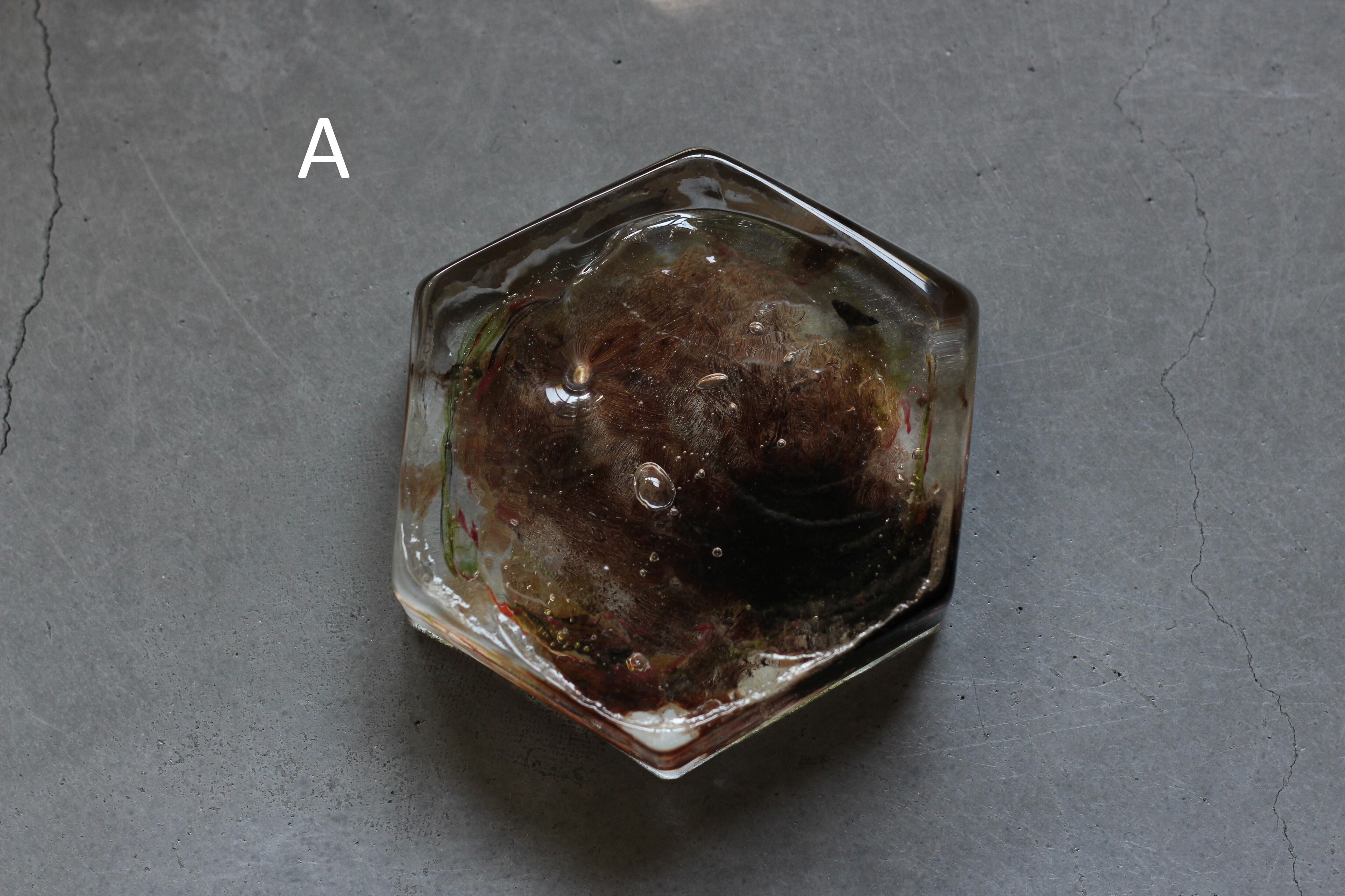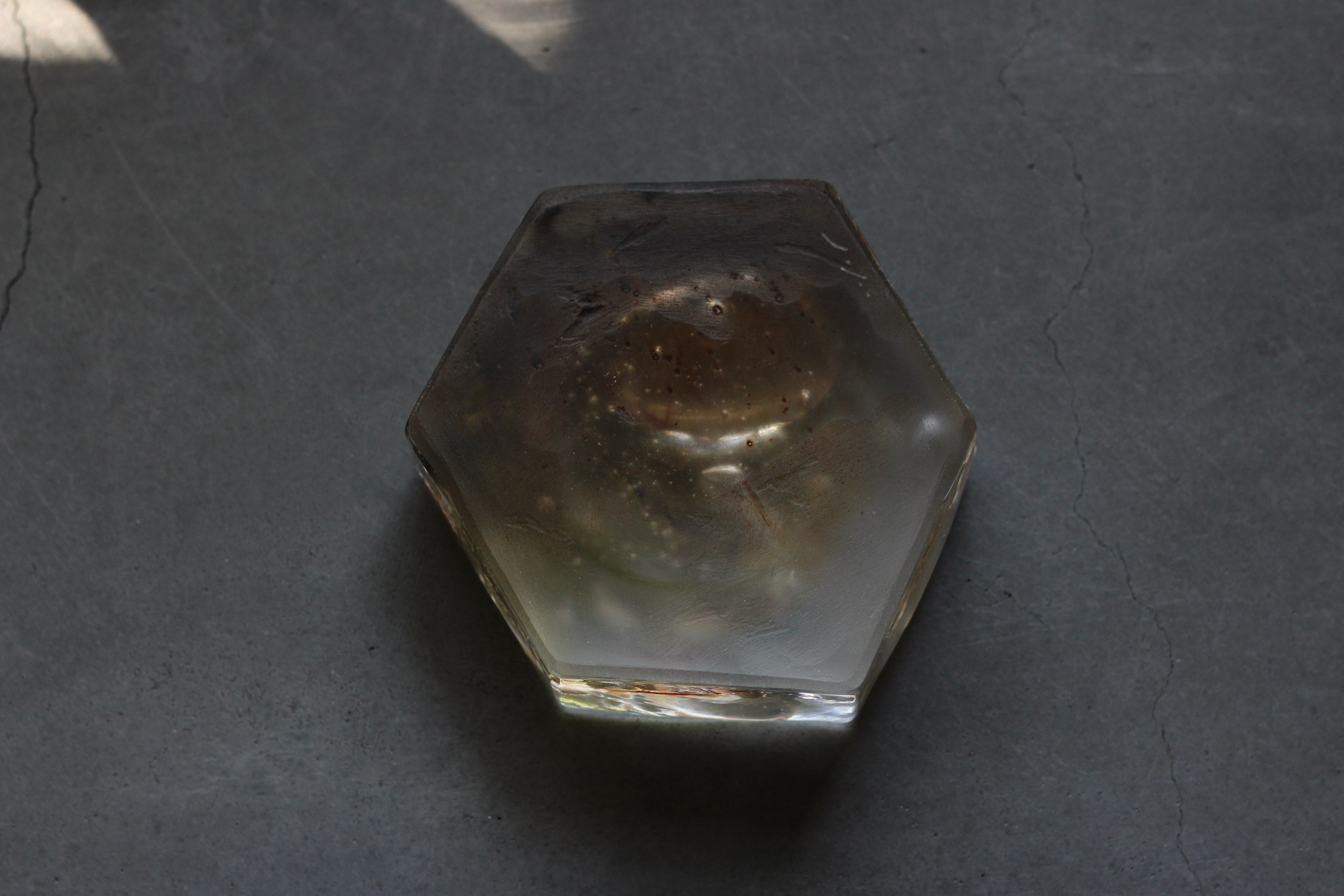 ガラスの表面に蝋を焼き付け、表面を燻らせています。その曖昧で不確かな焼き跡に、作為から離れた自然の風景を観ることがあります。燃えついた「跡」が誰かの心象風景に響く、そんな情緒的なモノを作れたらと思っています(境田さんより)。