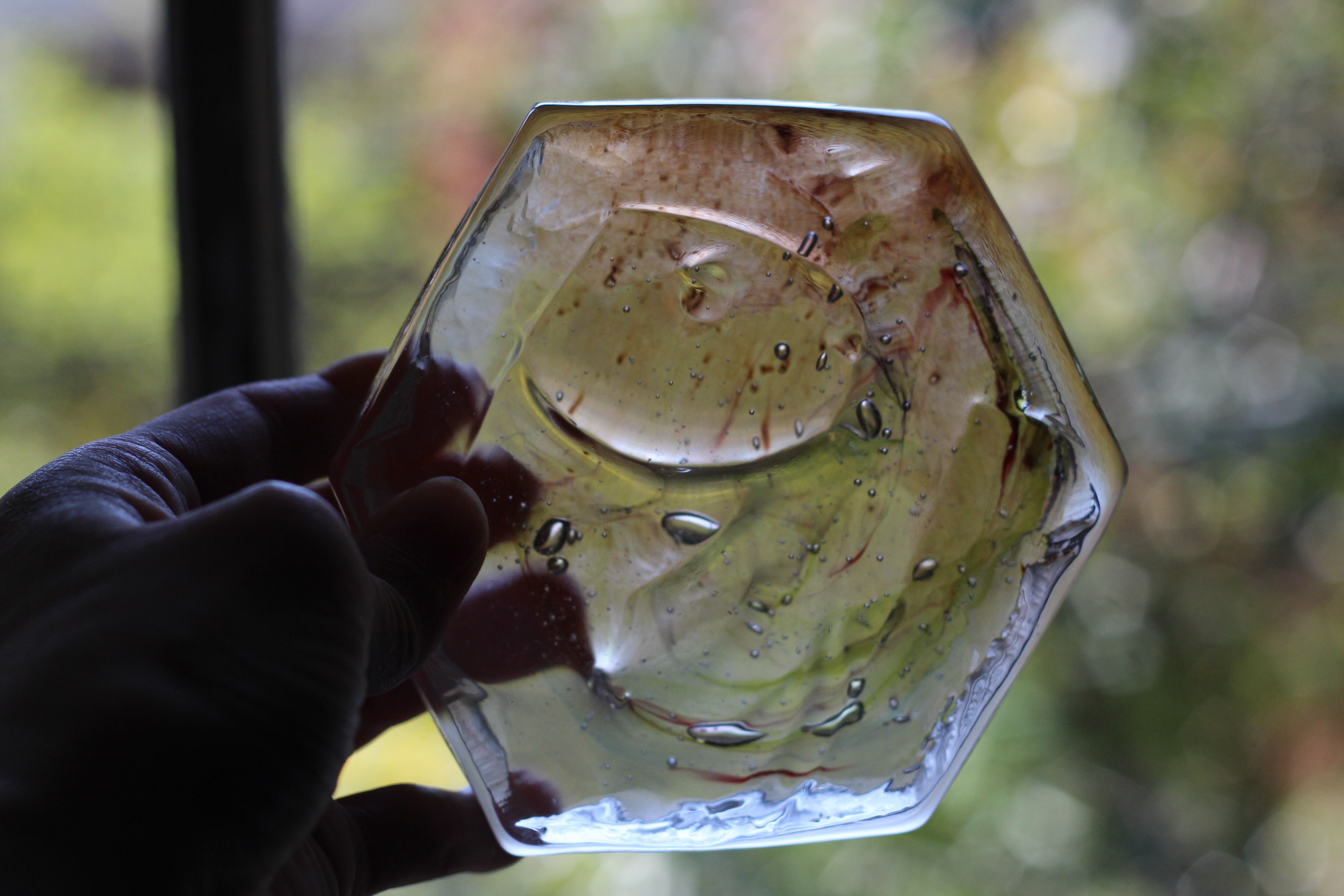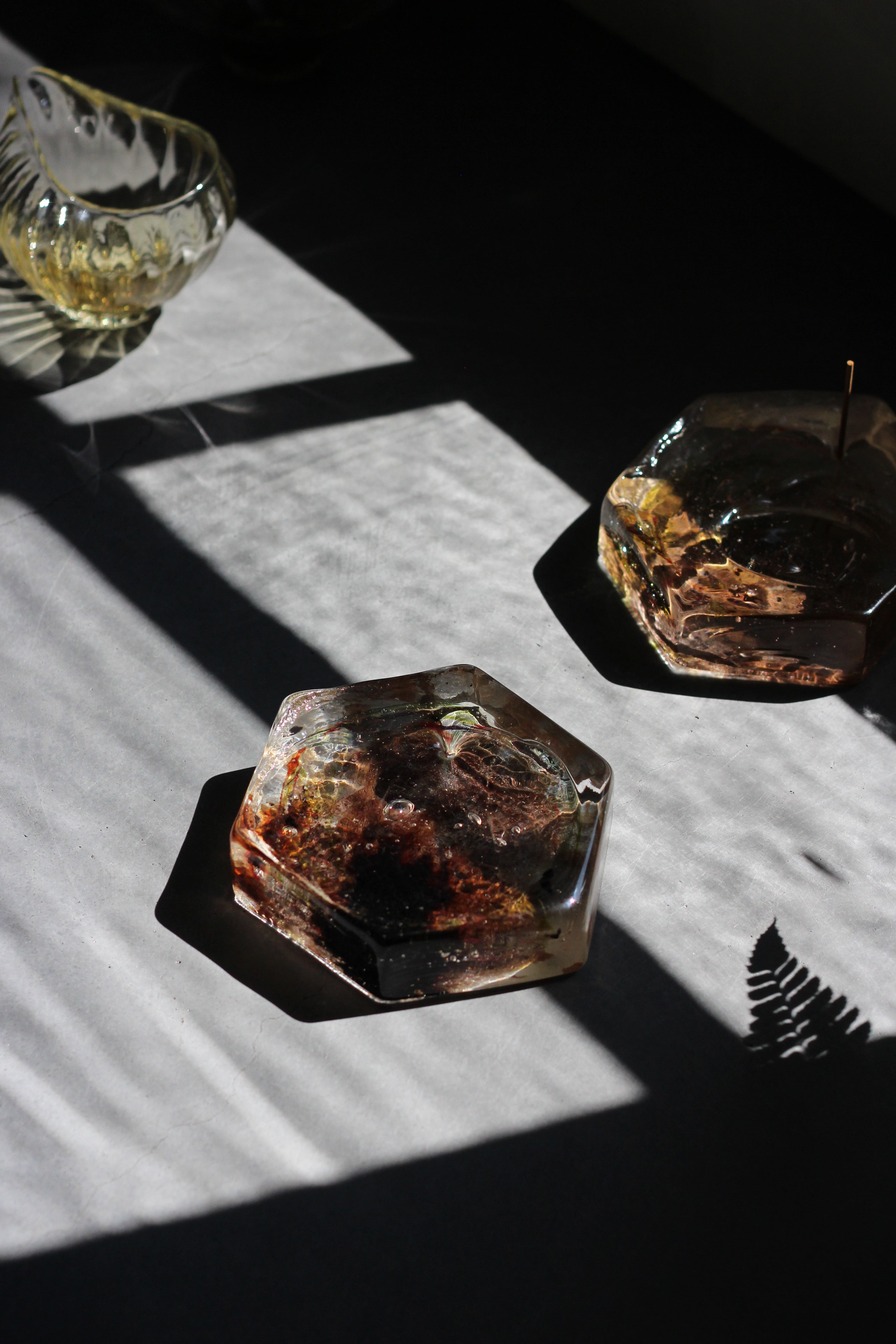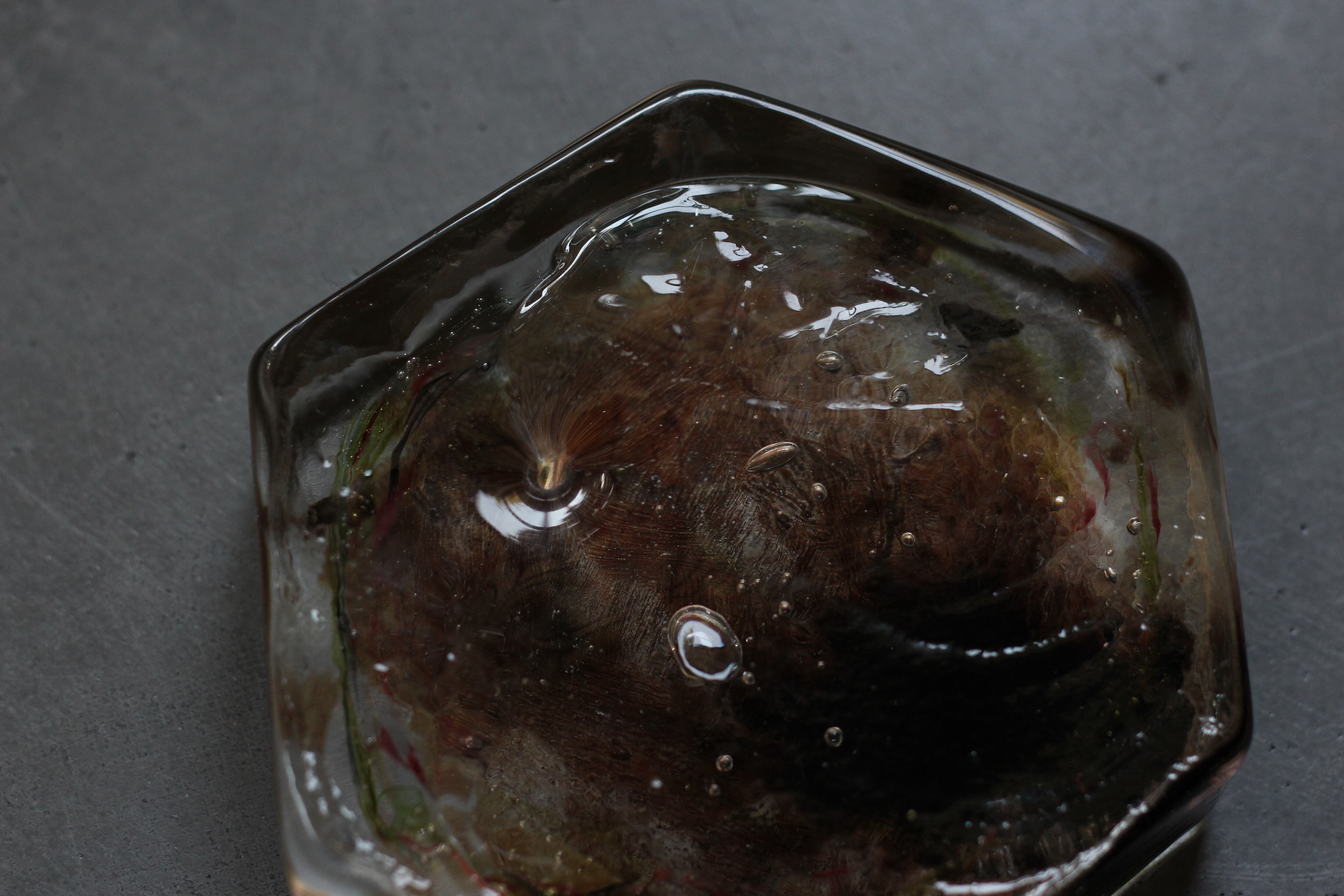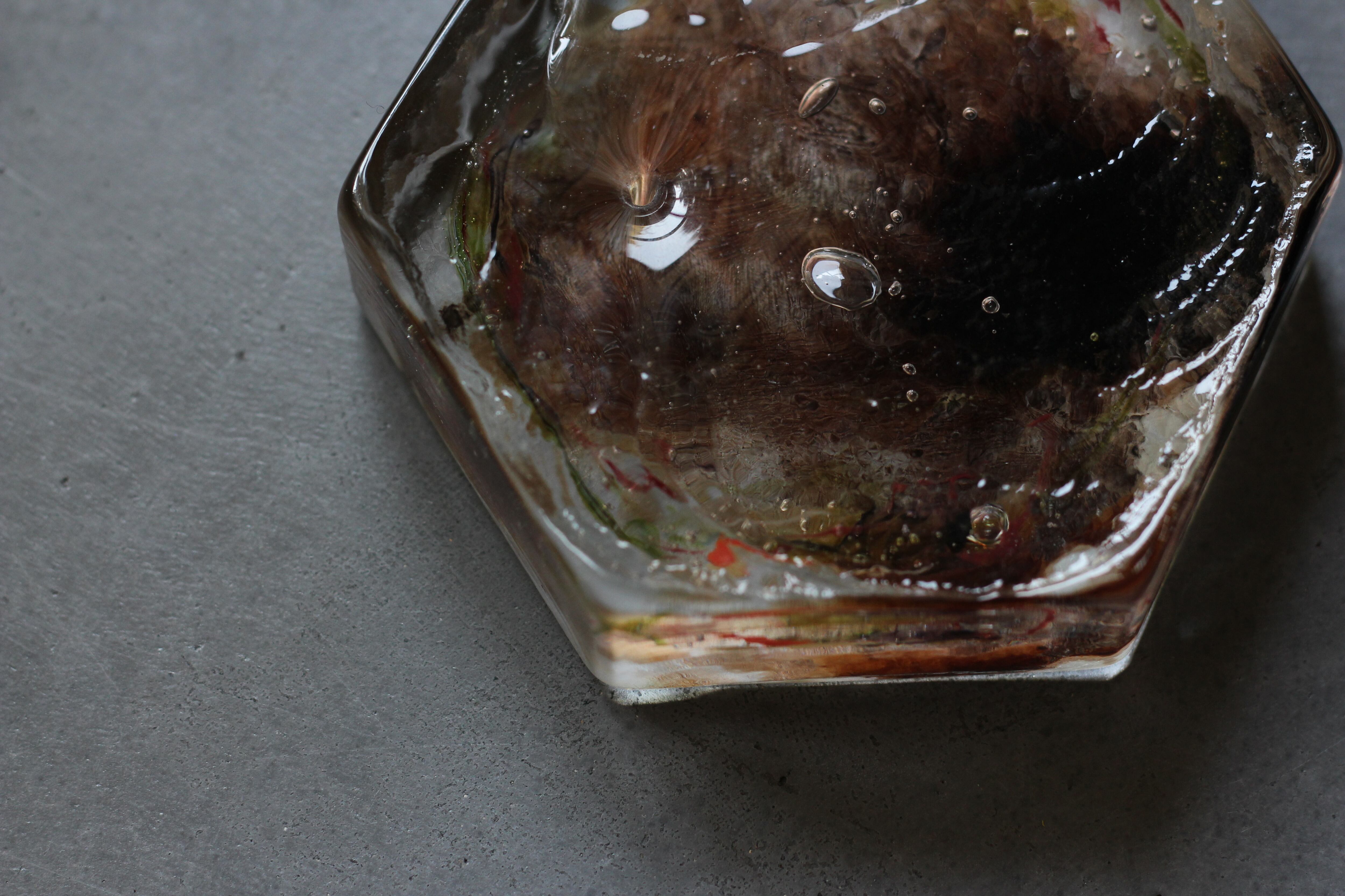 ガラスの表面に蝋を焼き付け、表面を燻らせています。その曖昧で不確かな焼き跡に、作為から離れた自然の風景を観ることがあります。燃えついた「跡」が誰かの心象風景に響く、そんな情緒的なモノを作れたらと思っています(境田さんより)。