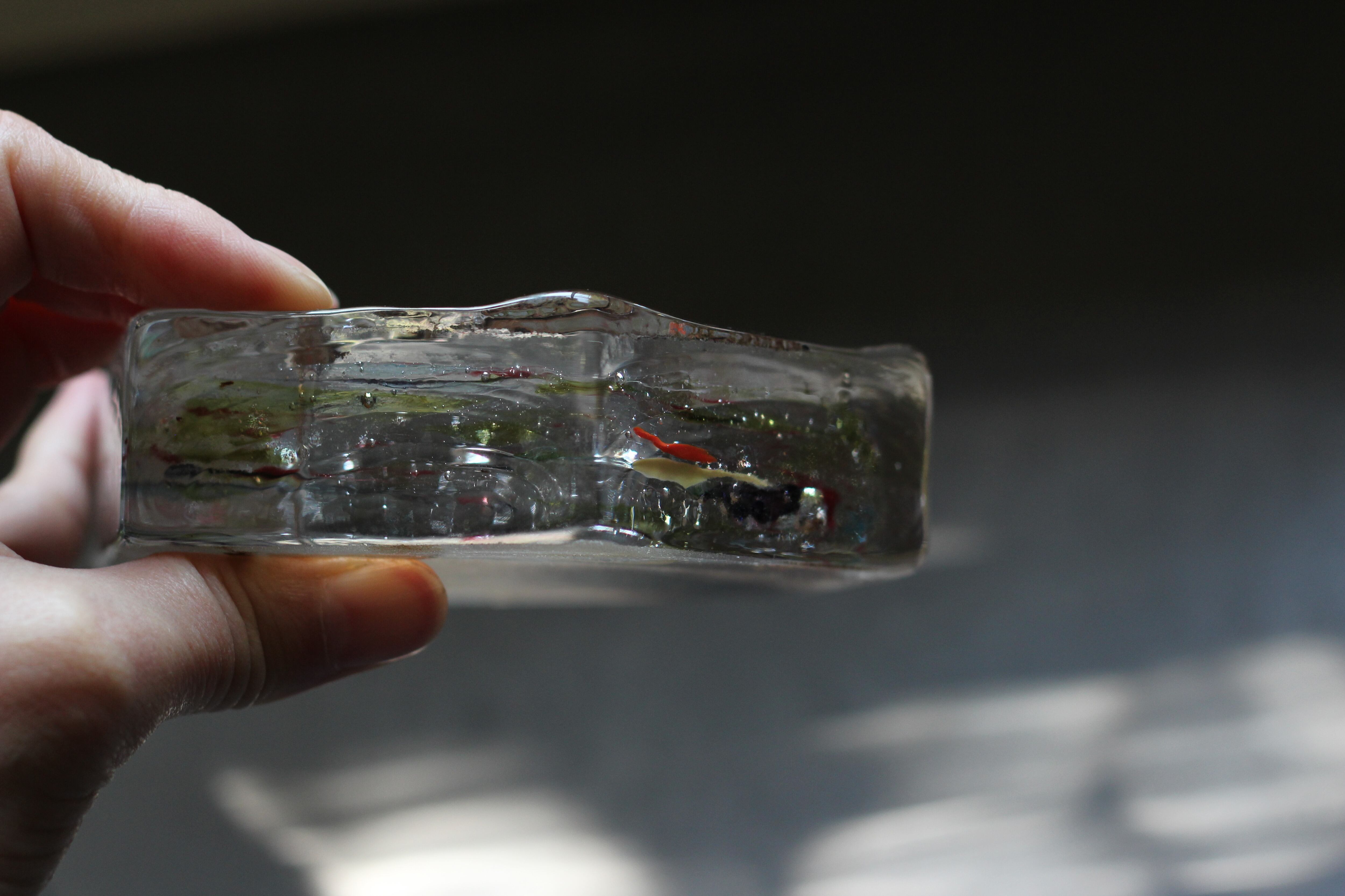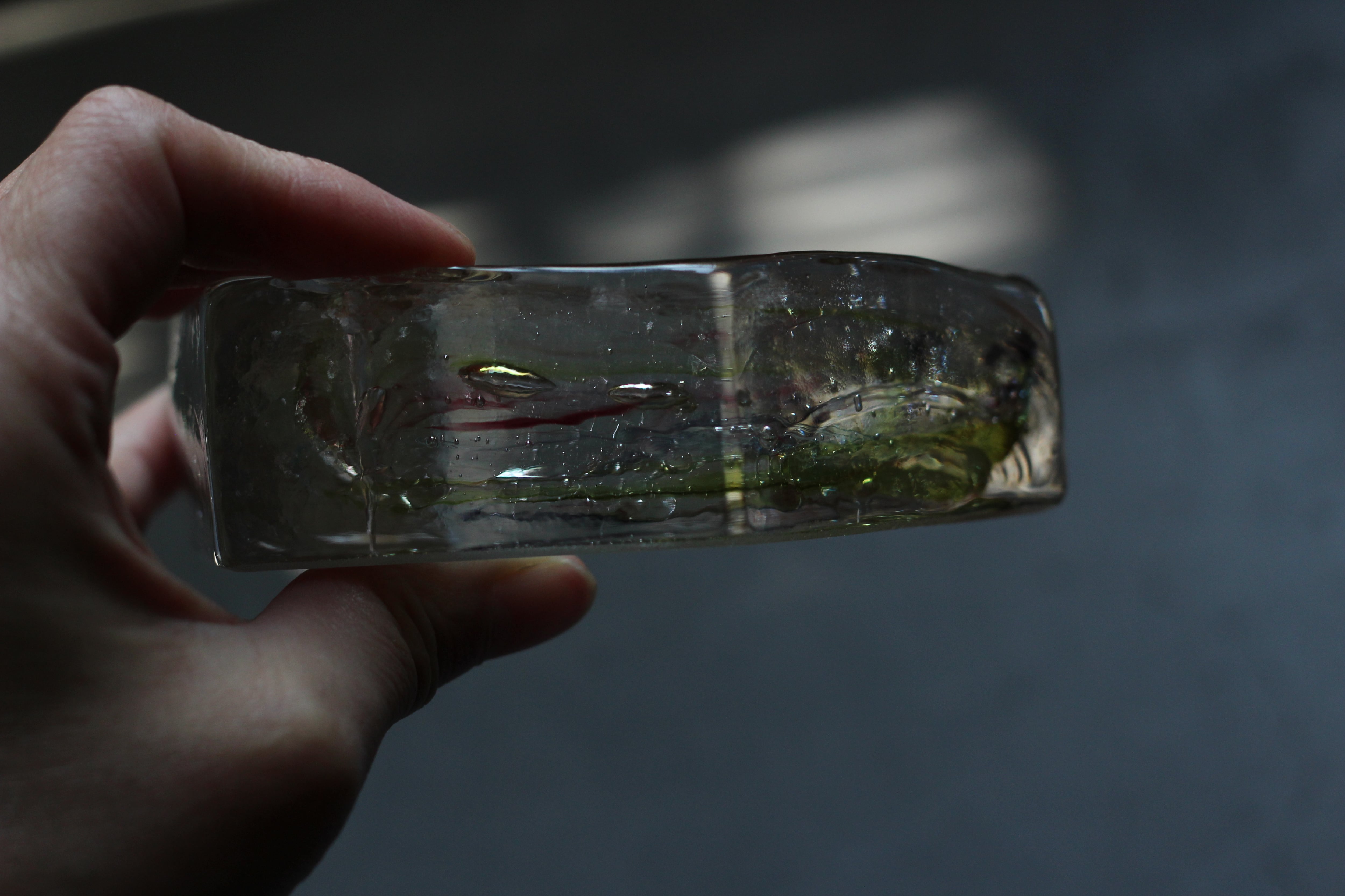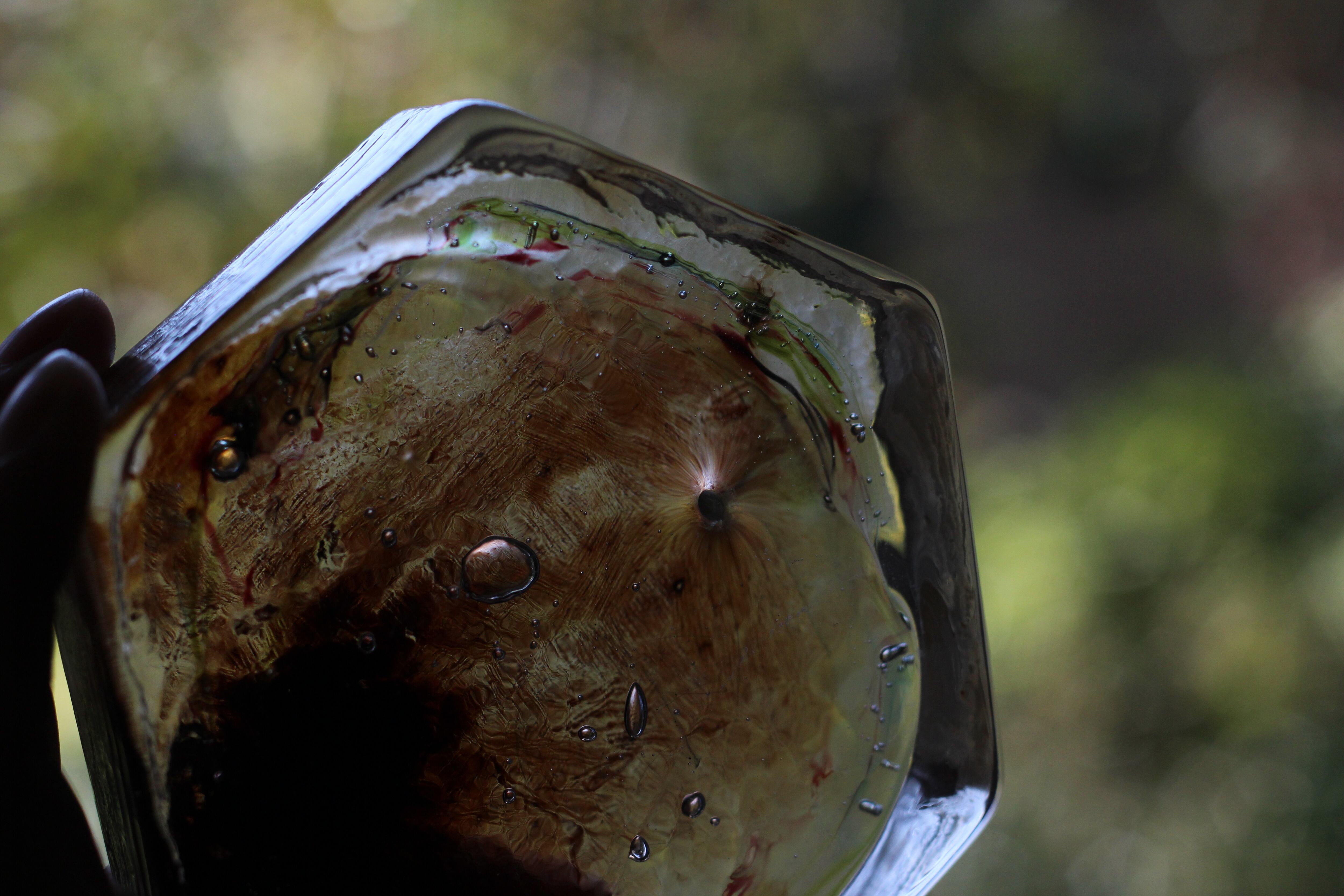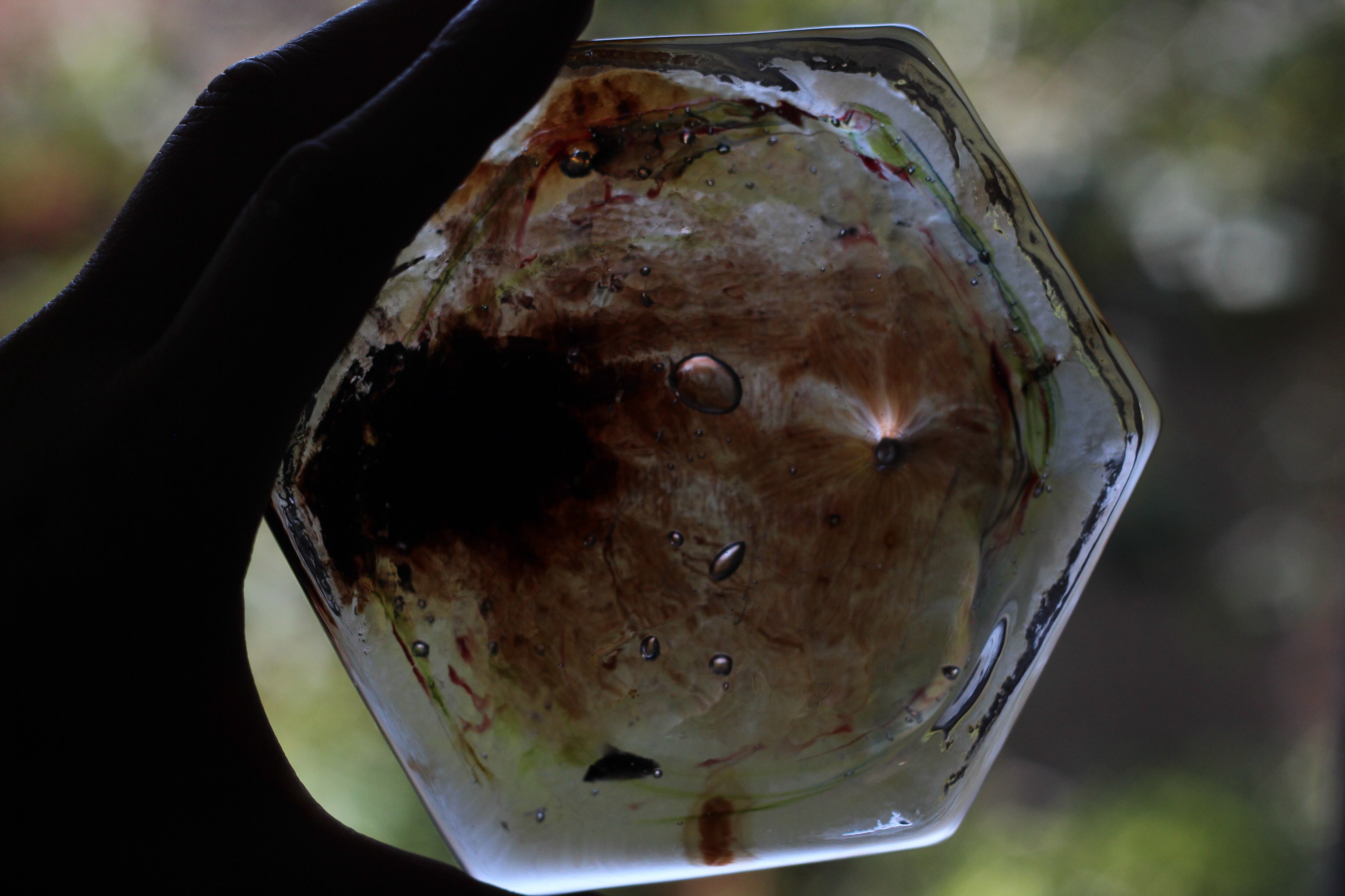 ガラスの表面に蝋を焼き付け、表面を燻らせています。その曖昧で不確かな焼き跡に、作為から離れた自然の風景を観ることがあります。燃えついた「跡」が誰かの心象風景に響く、そんな情緒的なモノを作れたらと思っています(境田さんより)。